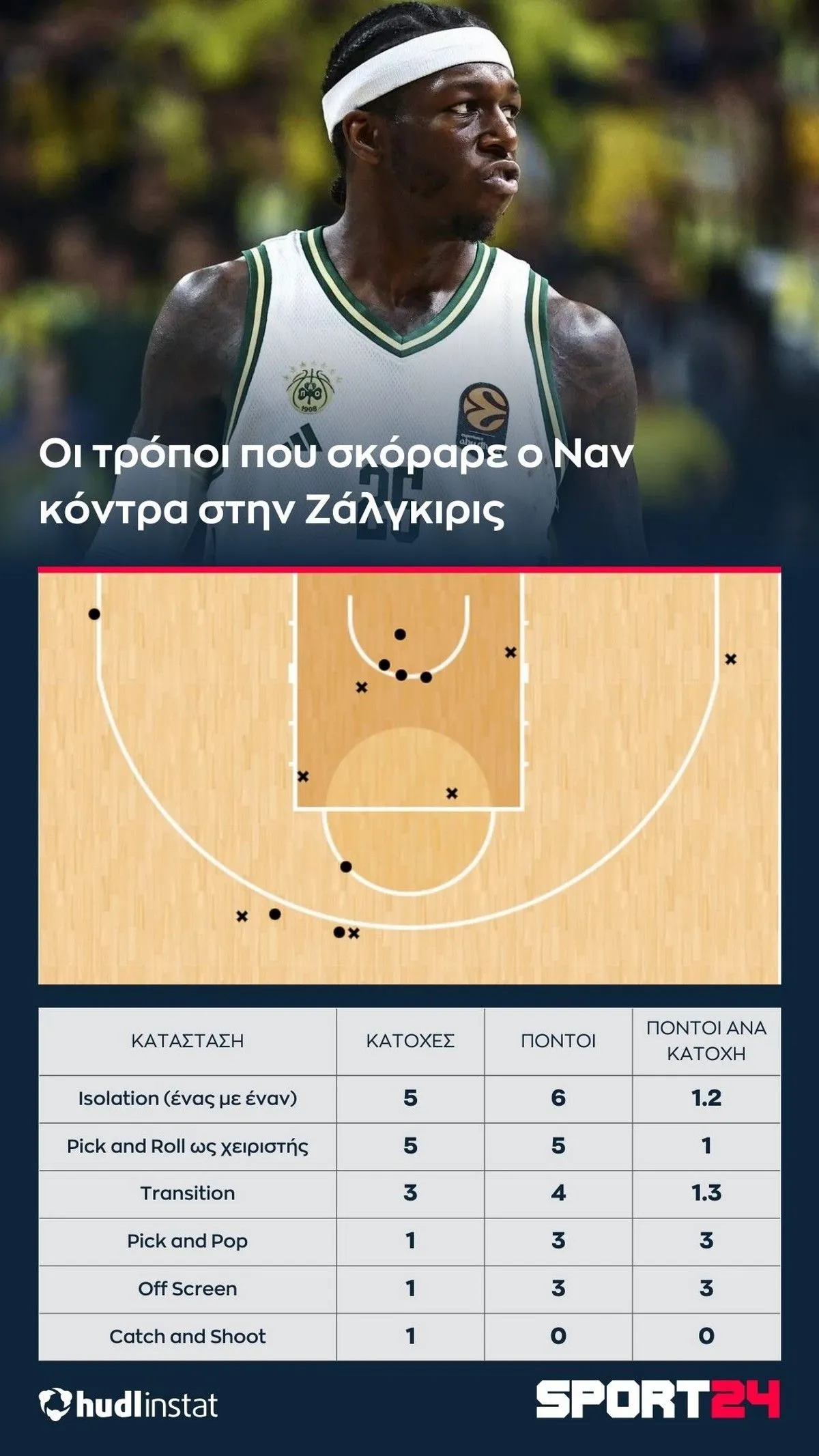 Ο Ναν ξεκίνησε ήσυχα το ματς. Στην τέταρτη περίοδο ωστόσο ανέβασε κατακόρυφα, σημειώνοντας 12 από τους 21 πόντους του σε αυτό το διάστημα. Και μιλώντας για την 4η περίοδο.