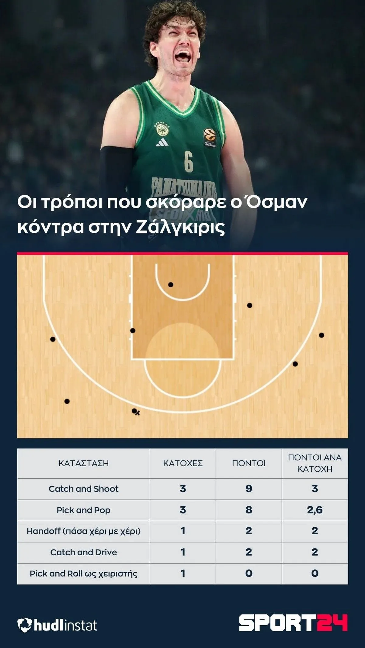 Ο Όσμαν έδωσε ταχύτητα στο “τριφύλλι”. Και αυτό πολλαπλασιάστηκε μετά την απόφαση του Έργκιν Αταμάν να χρησιμοποιήσει τον Τούρκο ως σκρινέρ σχεδόν σε όλη την 4η περίοδο, ζητώντας από τον φόργουορντ της ομάδας να κάνει συχνά Ghost Screen (μετάφραση: Όταν ο παίκτης τρέχει και φαίνεται ότι πάει να κάνει σκριν, αλλά τελικά περνάει απλώς από πίσω από τον παίκτη που μαρκάρει τον χειριστή, βγαίνοντας στο τρίποντο). Ιδού ένα παράδειγμα: