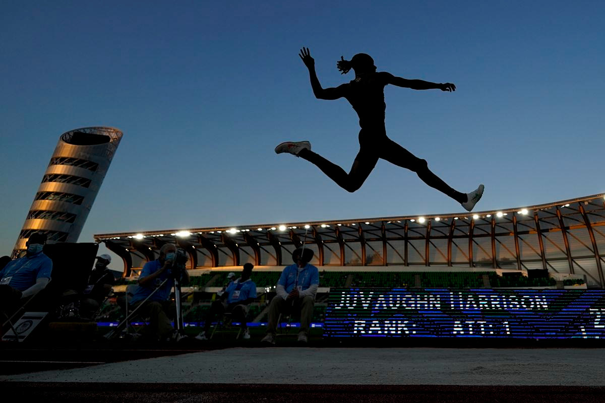 FILE - In this June 27, 2021, file photo, JuVaughn Harrison competes during the finals of the men's long jump at the U.S. Olympic Track and Field Trials in Eugene, Ore. Harrison will compete at the Tokyo Games in the long jump and the high jump. Not since the days of Jim Thorpe in 1912 has an American man made the team in those two events at one Olympics. (AP Photo/Charlie Riedel, File)