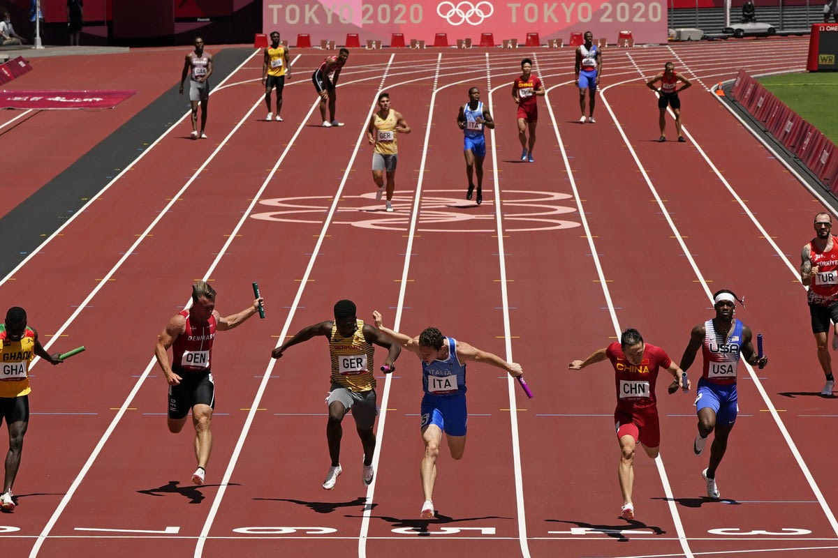 Σε αγώνες χωρίς ελληνική παρουσία, η σκυταλοδρομία στα 100μ. των ανδρών ξεχωρίζει, ακόμα και χωρίς την παρουσία των ΗΠΑ στον τελικό.