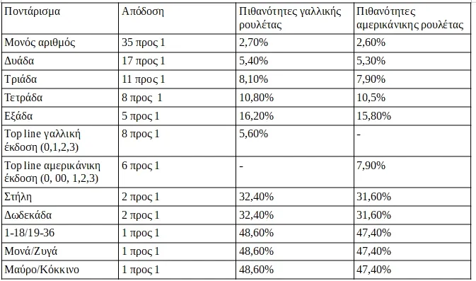 Οπως σε κάθε τυχερό παίγνιο έτσι και στη ρουλέτα πρέπει να ξέρουμε τι κυνηγάμε. Πότε κερδίζουμε, αλλά και τι κερδίζουμε. Παρακάτω παραθέτουμε τον πίνακα που αναλύει τις πιθανότητες και τις πληρωμές ανάλογα με το ποντάρισμά μας.