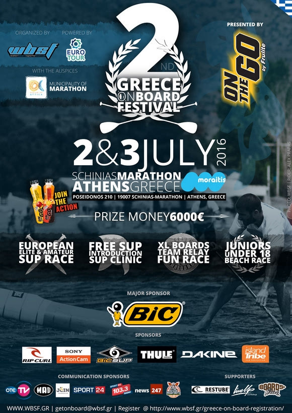 Το Greece On Board Festival είναι μια διοργάνωση του WBSF (Water Board Sports Festival) που τελείται υπό την Αιγίδα της Περιφέρειας Αττικής και του Δήμου Μαραθώνα και είναι ένα διήμερο γεμάτο συναρπαστικούς αγώνες SUP.