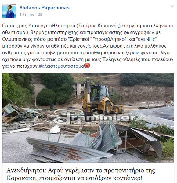 Όταν έγινε γνωστό πως ο Δήμος Δράμας κατεδάφισε το σκοπευτήριο στο οποίο προπονούνταν η Άννα Κορακάκη, τα σχόλια που ακολούθησαν ήταν διάφορα. Κυρίως οργής, με τον Στέφανο Παπαρούνα να πηγαίνει ένα βήμα παραπέρα και να εκφράζει τον εκνευρισμό του μέσω των social media.