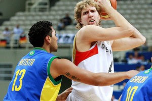 Παρά το γεγονός ότι ο Ντιρκ Νοβίτσκι ξεκίνησε… μουδιασμένος η Γερμανία κατάφερε να βρει τον τρόπο να επιβάλει το ρυθμό της. Με πρωταγωνιστή τον Βικότσκι τα “πάντσερ” πήραν ένα μικρό προβάδισμα, πριν δεχτούν την αντεπίθεση της Βραζιλίας και συγκεκριμένα του Μαρσελίνιο Μασάδο που μπήκε στο παρκέ “ζεστός” μειώνοντας σε 14-13.