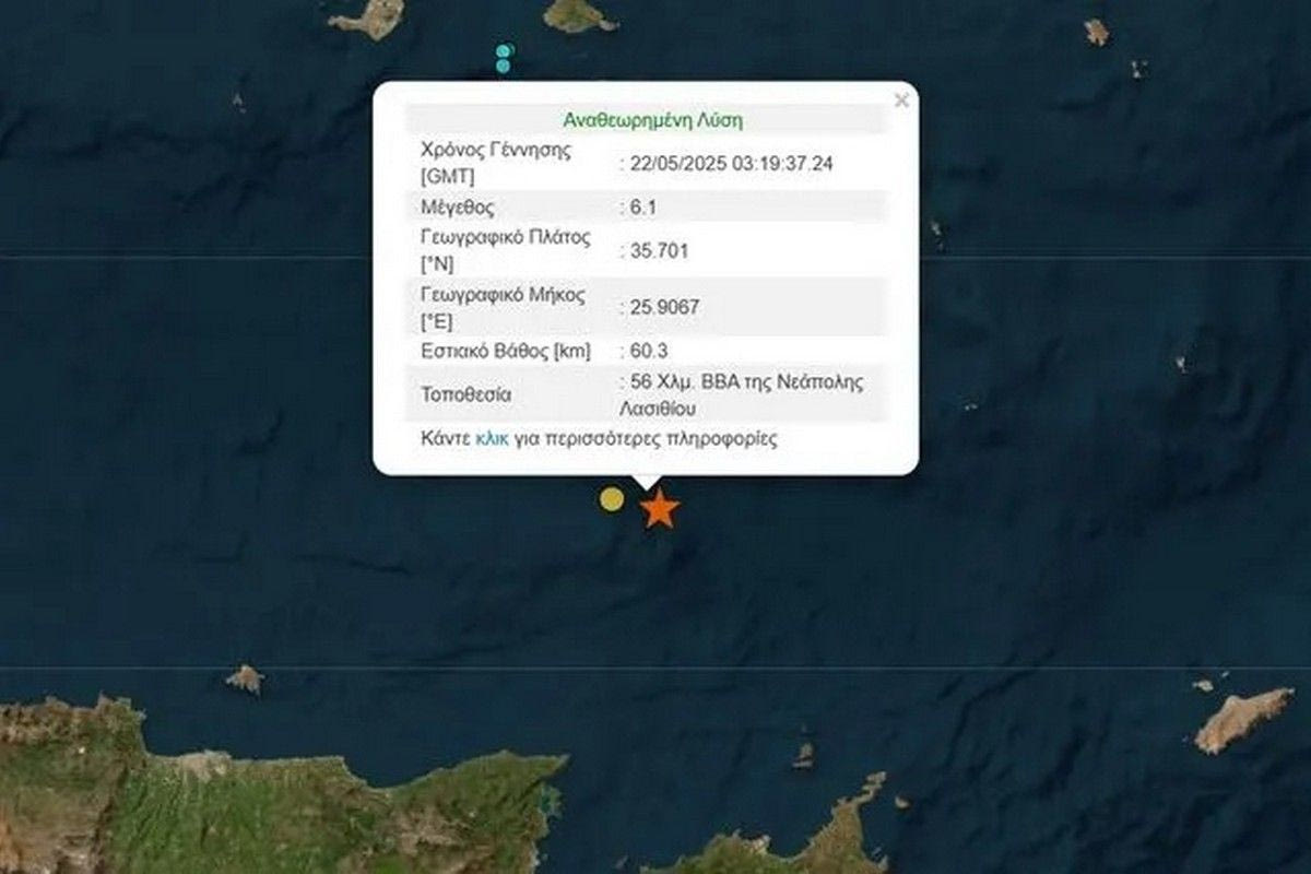 Ισχυρή σεισμική δόνηση μεγέθους 6,1 Ρίχτερ σημειώθηκε τα ξημερώματα της Πέμπτης (22/05) ανοιχτά της Κρήτης. Έγινε αισθητός και στην Αθήνα.