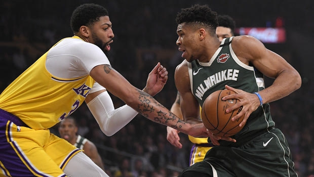 Milwaukee Bucks forward Giannis Antetokounmpo, right, drives to the basket as Los Angeles Lakers forward Anthony Davis defends during the first half of an NBA basketball game Friday, March 6, 2020, in Los Angeles. (AP Photo/Mark J. Terrill)