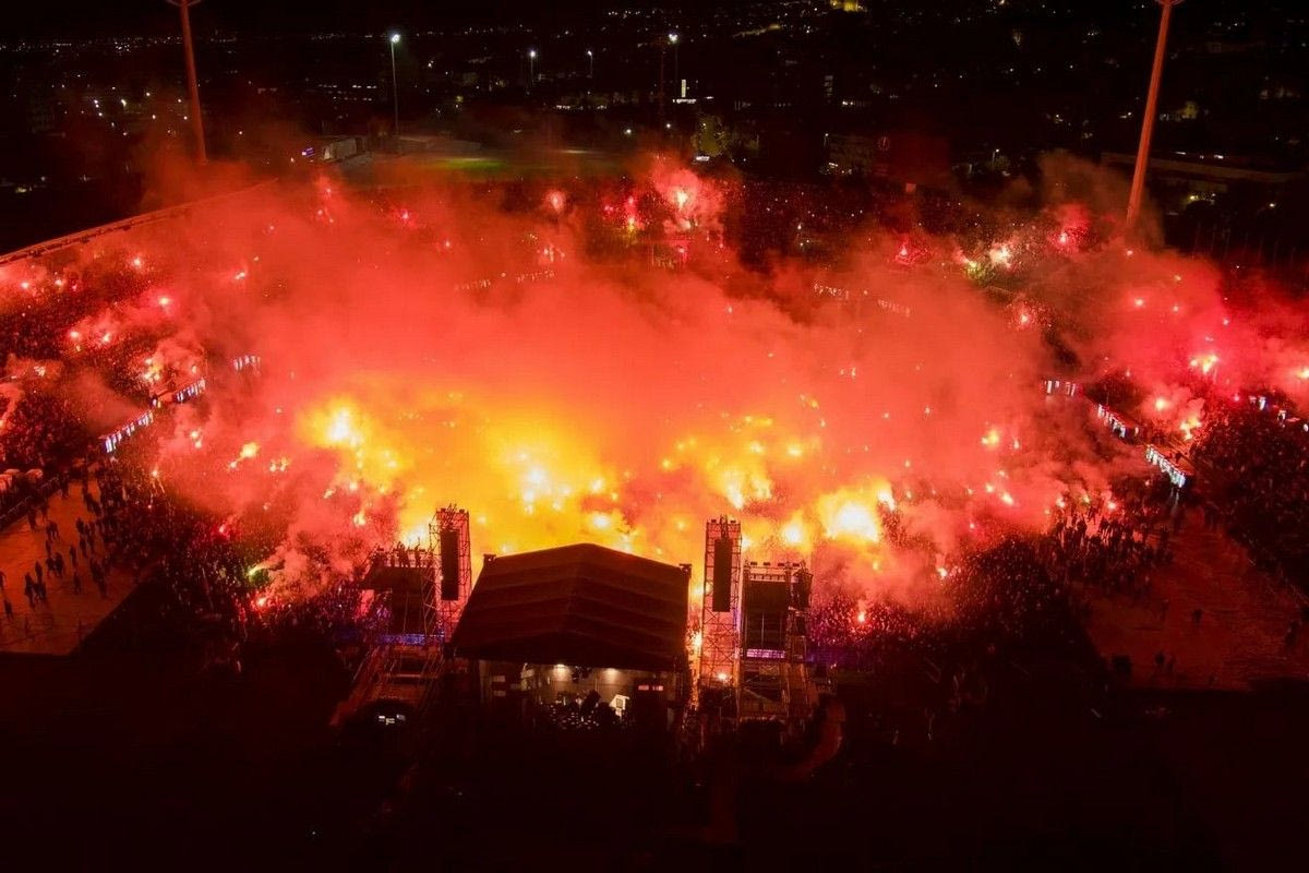Από τις 21:00, όταν ο ράπερ ανέβηκε στη σκηνή με το κομμάτι “3.000 Στροφές”, το στάδιο άρχισε να πάλλεται και ο ουρανός γέμισε κόκκινους καπνούς.