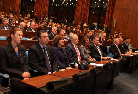Στην ομιλία του μεταξύ άλλων, ο Πρόεδρος της Ελληνικής Ολυμπιακής Επιτροπής Σπύρος Καπράλος επισήμανε: «Η κρίση που έπληξε τη χώρα μας είχε σοβαρές επιπτώσεις και στον ελληνικό αθλητισμό. Τα χρήματα της Πολιτείας για τον αθλητισμό έχουν περικοπεί δραματικά και περικόπτονται συνεχώς. Η Ελληνική Ολυμπιακή Επιτροπή είδε τον προϋπολογισμό της, τον οποίο λαμβάνει από το κράτος, να μειώνεται σε ποσοστό μεγαλύτερο του 50%, που δεν επαρκεί ούτε για τη μισθοδοσία του προσωπικού της. Το ειδικό κονδύλι που έδινε το Κράτος για την προετοιμασία των αθλητών υψηλού επιπέδου δόθηκε για τελευταία φορά το 2009.