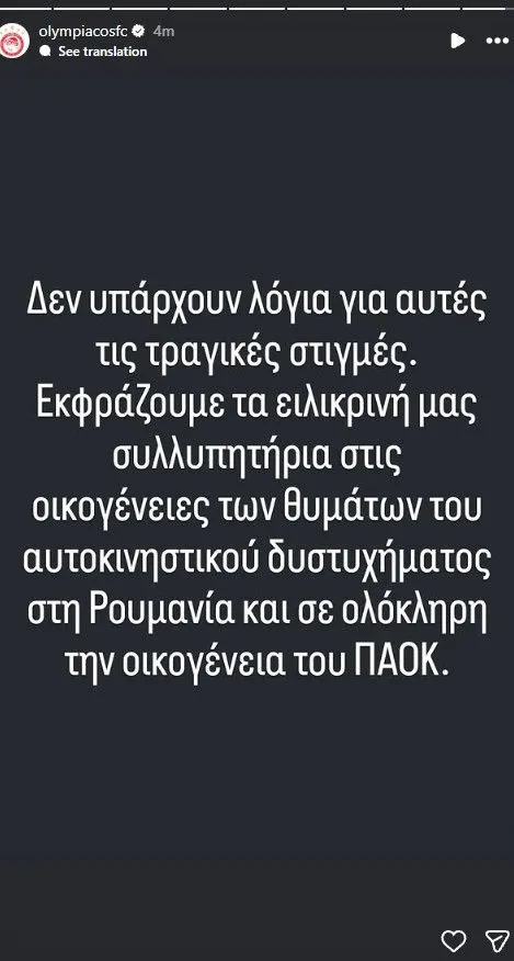 “Δεν υπάρχουν λόγια για αυτές τις τραγικές στιγμές. Εκφράζουμε τα ειλικρινή μας συλλυπητήρια στις οικογένειες των θυμάτων του αυτοκινηστικού δυστυχήματος στη Ρουμανία και σε ολόκληρη την οικογένεια του ΠΑΟΚ”.