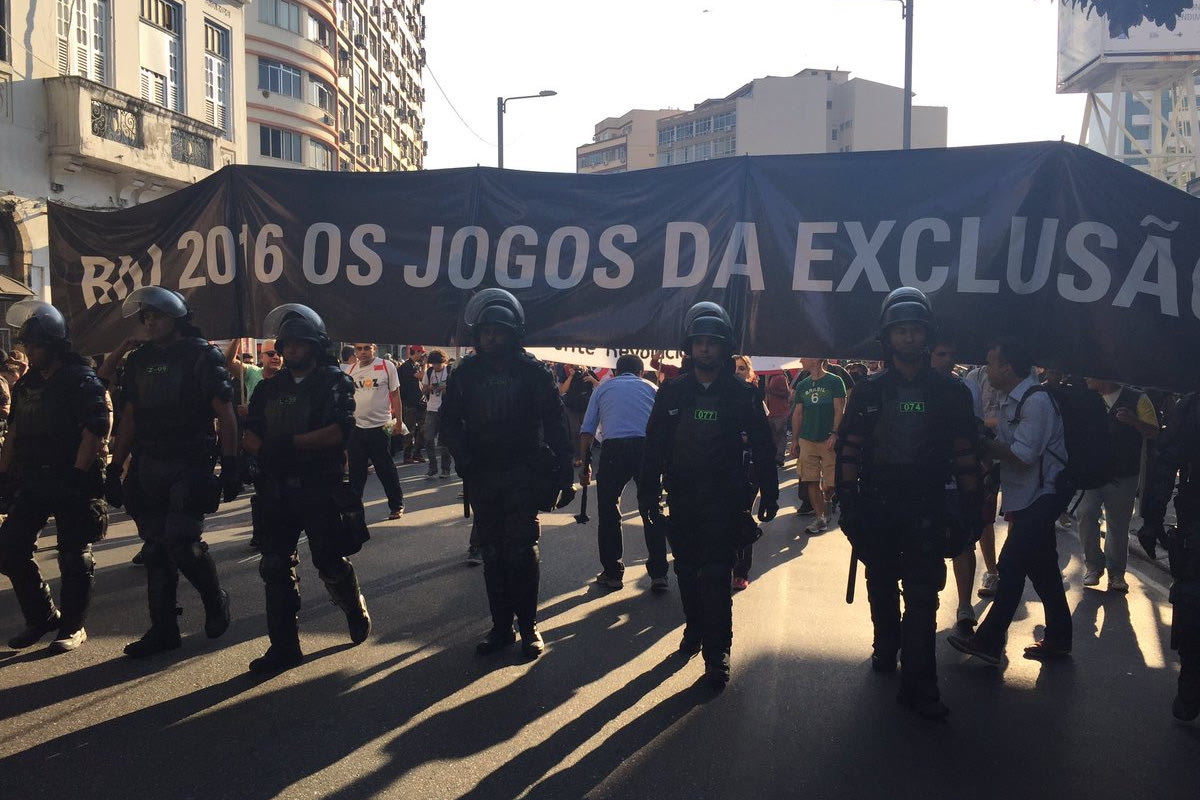 Οι διαδηλωτές που βγήκαν κατά χιλιάδες στους δρόμους έκαιγαν σημαίες της Βραζιλίας και των Ολυμπιακών Αγώνων και φώναζαν συνθήματα κατά της διοργάνωσης και της Κυβέρνησης.