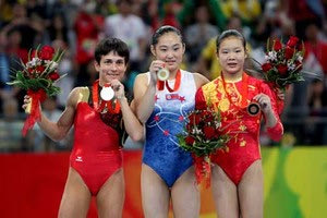 Η γυμνάστρια από τη Βόρεια Κορέα βαθμολογήθηκε συνολικά με 15.650 στις δύο προσπάθειές της και ανέβηκε στο ψηλότερο σκαλί του βάθρου, αφήνοντας πίσω της τη Γερμανίδα Οξάνα Τσουσοβίτινα και την Κινέζα Φέι Τσενγκ.