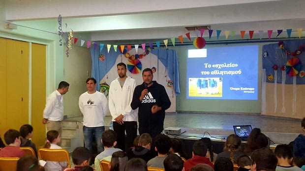 Στην κατάμεστη αίθουσα, με περισσότερα από 150 παιδιά όλων των τάξεων, τους δασκάλους και πολλούς γονείς οι αθλητές μας, μεταξύ άλλων, εξιστόρησαν την πλούσια καριέρα τους, αναφέρθηκαν στα οφέλη της Άθλησης, σωματικά και πνευματικά, μίλησαν για το μπούλινγκ και εξήγησαν συνοπτικά την ιδέα της Ολυμπιακής Εκεχειρίας!