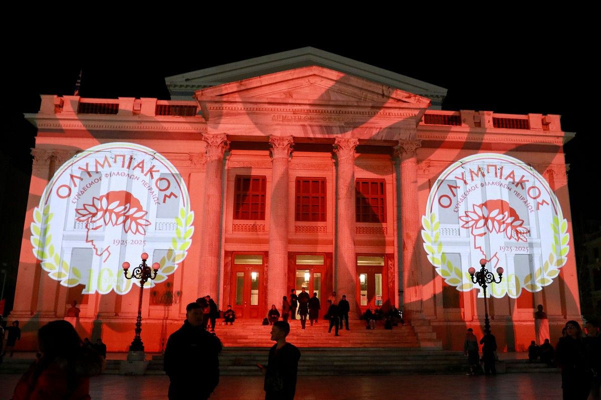 100 χρόνια Ολυμπιακός: Φωταγωγήθηκε στα ερυθρόλευκα το Δημοτικό Θέατρο Πειραιά