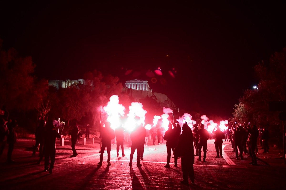 Οι φίλοι του Ολυμπιακού έριξαν κόκκινο στη νύχτα και στο Θησείο λίγο μετά τα μεσάνυχτα για τη συμπλήρωση 100 χρόνων από την ίδρυση των Πειραιωτών.