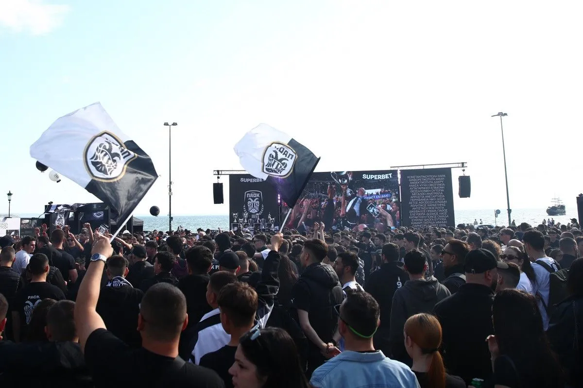 Ο ΠΑΟΚ γιορτάζει τα 100 χρόνια από την ίδρυσή του και στη Θεσσαλονίκη έχει ξεσπάσει μια γιορτή στην πλατεία Αριστοτέλους. Οι φίλοι του Δικεφάλου γέμισαν την πλατεία Αριστοτέλους στις απογευματινές ώρες και έστησαν τη δική τους φιέστα για τα γενέθλια της αγαπημένης τους ομάδας.