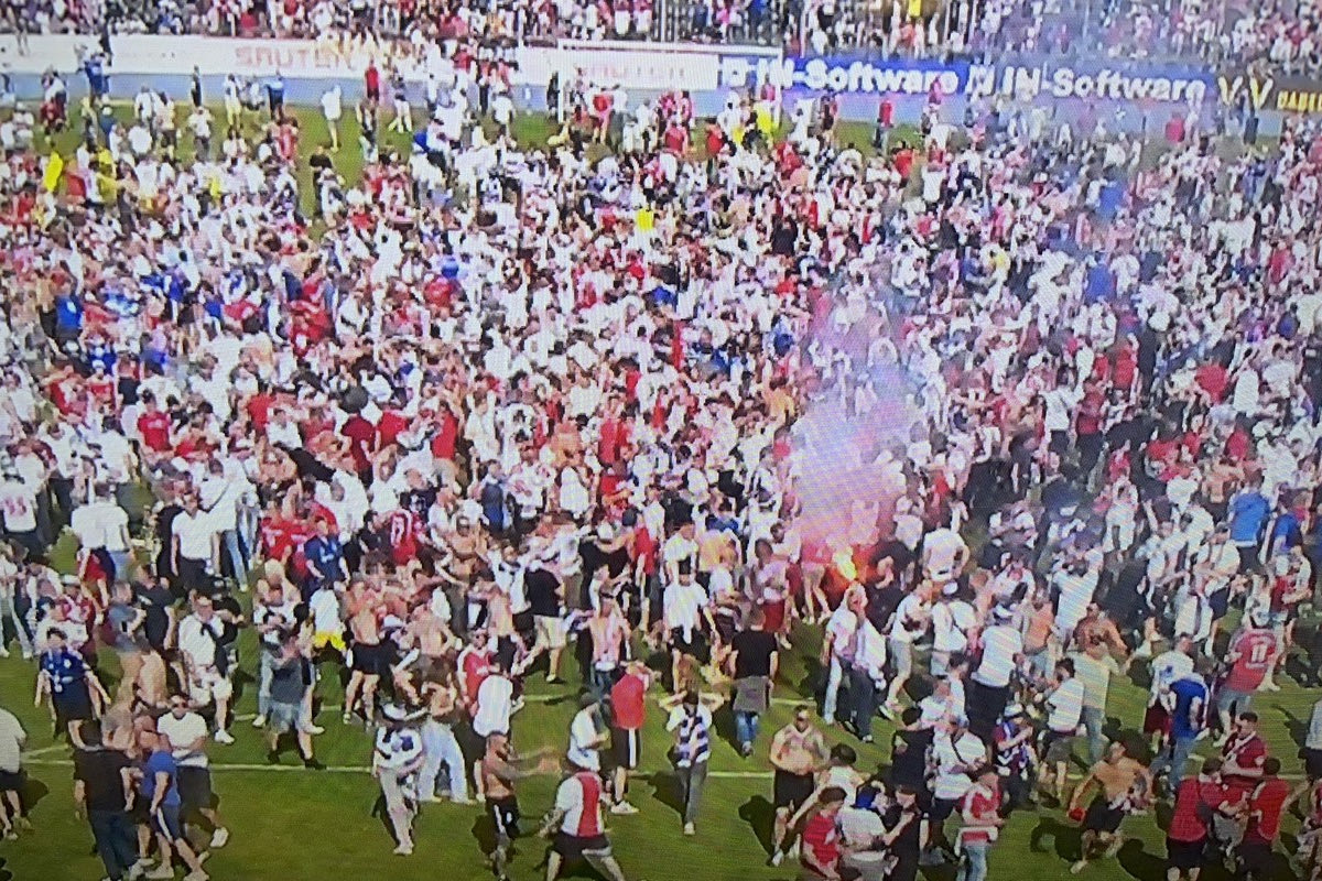 Οι οπαδοί του Αμβούργου μπήκαν στον αγωνιστικό χώρο για να πανηγυρίσουν μετά τη νίκη επί της Σαντχάουζεν. Αργότερα ήρθε η ανατροπή από την Χάιντενχαϊμ, που έστειλε την HSV στο μπαράζ.