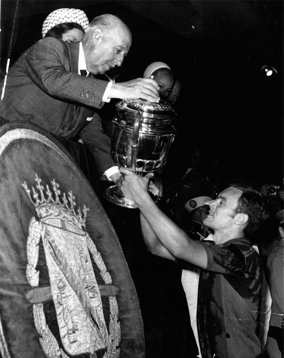 Ο Ενρίκ Γιαουδέτ αποχαιρετάει τους φίλαθλους της Μπαρτσελόνα στο “Καμπ Νόου”, στο τέλος της θητείας του το 1968