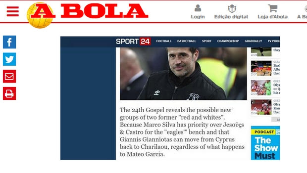 Οι πορτογαλικές “A Bola” και “Record” επικαλούνται το Sport24.gr για το μέλλον του Μάρκο Σίλβα και αναφέρουν το ρεπορτάζ του Ευάγγελου Μίχου αναφορικά με τα δεδομένα που ισχύουν στην υπόθεση και γιατί έχει προτεραιότητα έναντι των Ζεσούς και Κάστρο, ώστε να αναλάβει το πηδάλιο των Λουζιτανών.