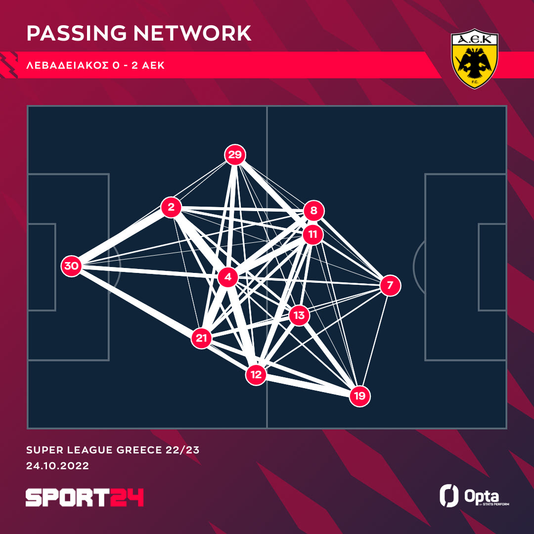 Την ίδια στιγμή έφτιαξε δύο τελικές προσπάθειες για την ΑΕΚ, όσες και ο Λιβάι Γκαρσία, έχοντας μια λιγότερη key pass, από τους Ελίασον και Γκατσίνοβιτς.