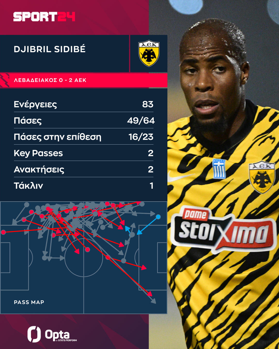 Η συνεισφορά του Σιντιμπέ ήταν ιδιαίτερα σημαντική στο κομμάτι της επίθεσης, στο οποίο επικεντρώθηκε το παιχνίδι της ΑΕΚ στο μεγαλύτερο μέρος του παιχνιδιού με τον Λεβαδειακό. Ο 30χρονος μπακ μοίρασε 23 πάσες στην επίθεση, μόλις μια λιγότερη από τον “πρώτο” Γκατσίνοβιτς.