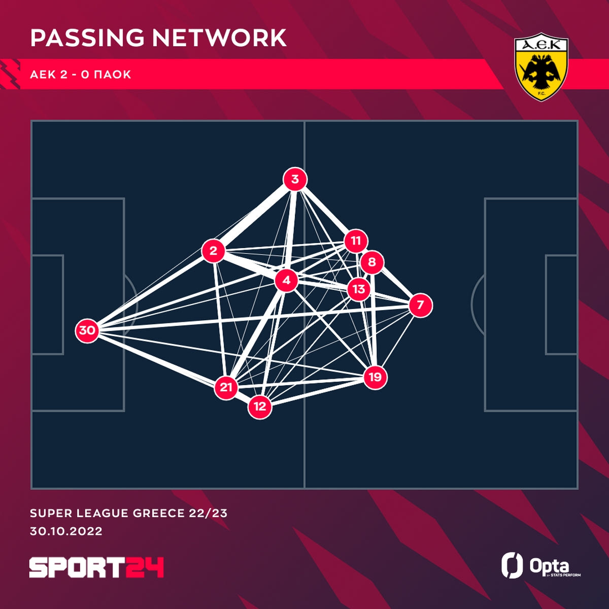 Στο παρακάτω γράφημα της Opta/Stats Perform φαίνεται το δίκτυο μεταβιβάσεων των ποδοσφαιριστών της ΑΕΚ στον αγώνα με την ομάδα του Ραζβάν Λουτσέσκου. Ο Λιβάι Γκαρσία, γι’ ακόμη μία αναμέτρηση, αποτέλεσε τον παίκτη που αγωνίστηκε πιο ψηλά μέσα στο γήπεδο, ως καθαρό φορ, ενώ την ίδια στιγμή οι Γκατσίνοβιτς, Πινέδα και Αραούχο εναλλάσσονταν στα αριστερά, δημιουργώντας διαρκώς ρήγματα και προβλήματα στους αμυντικούς του ΠΑΟΚ.