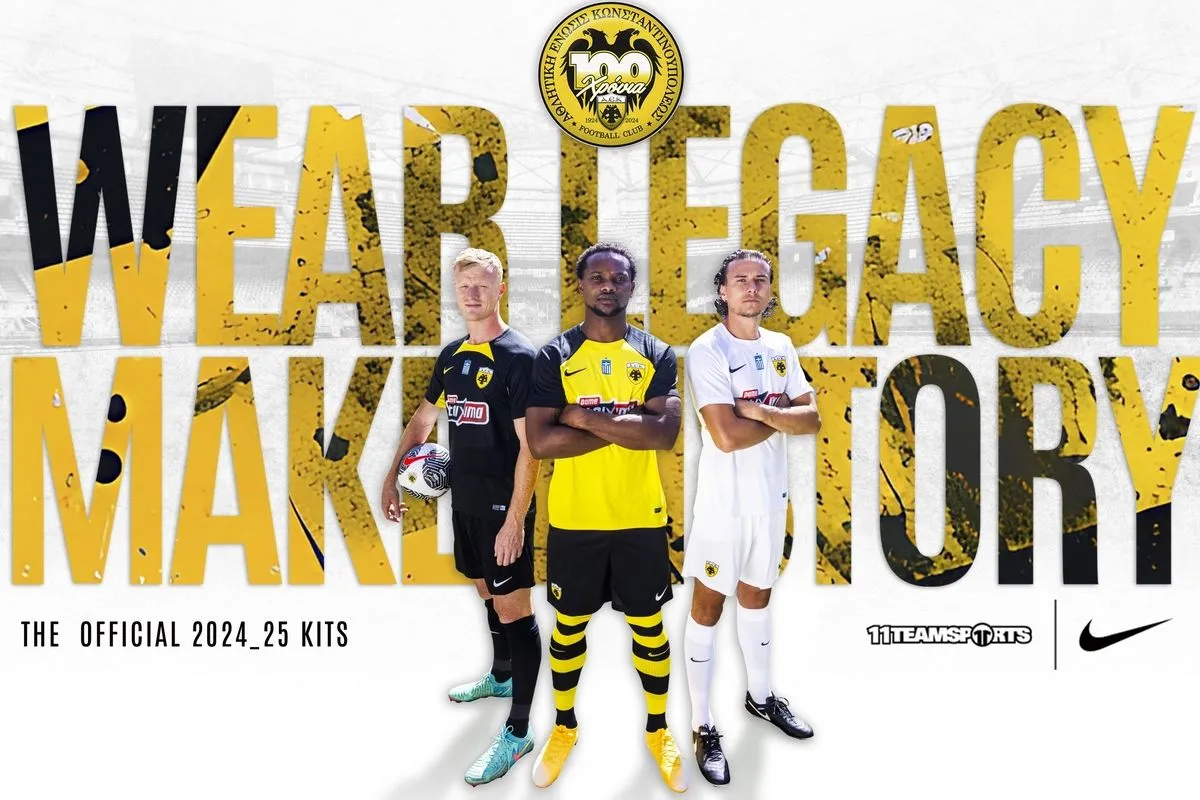 “Αποκαλυπτήρια για τις νέες φανέλες της ΑΕΚ! Οι επίσημες εμφανίσεις της ομάδας μας για την αγωνιστική περίοδο 2024 – 2025 είναι εδώ, σε συνεργασία με τη Nike και την 11Teamsports.