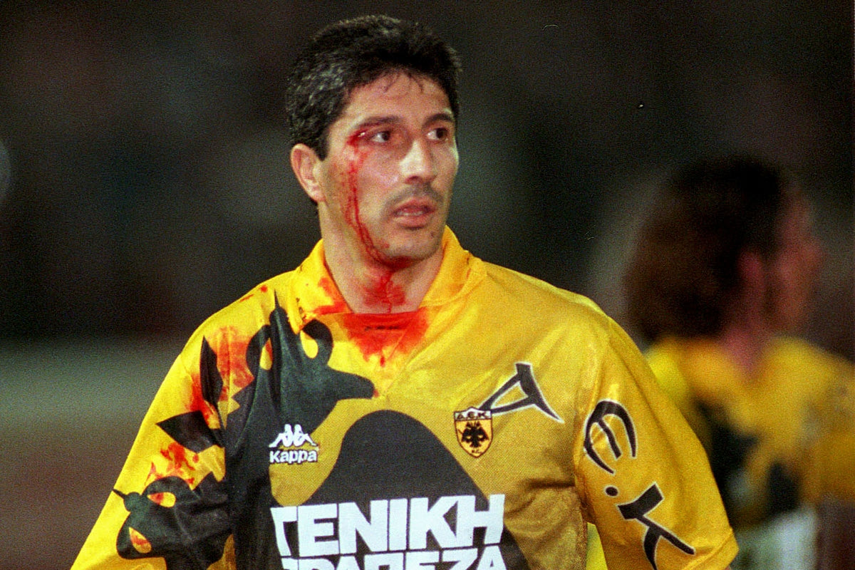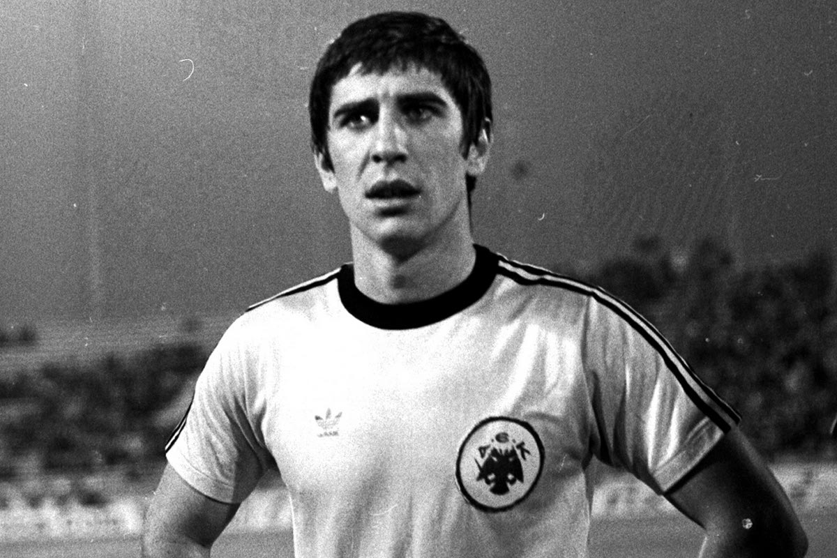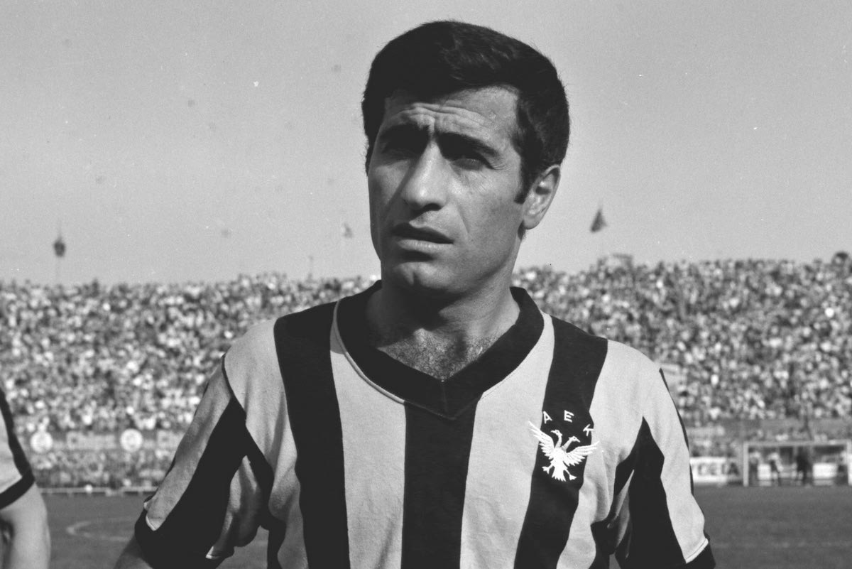 Με το χέρι απλωμένο μπροστά και τη μπάλα στα πόδια, ο ζωντανός θρύλος της ΑΕΚ είναι σαν να λέει στους αντιπάλους του… μην πλησιάζετε, ξέρετε την εξέλιξη. Ντυμένος στα κιτρινόμαυρα με εμφάνιση της δεκαετίας του ’60.
