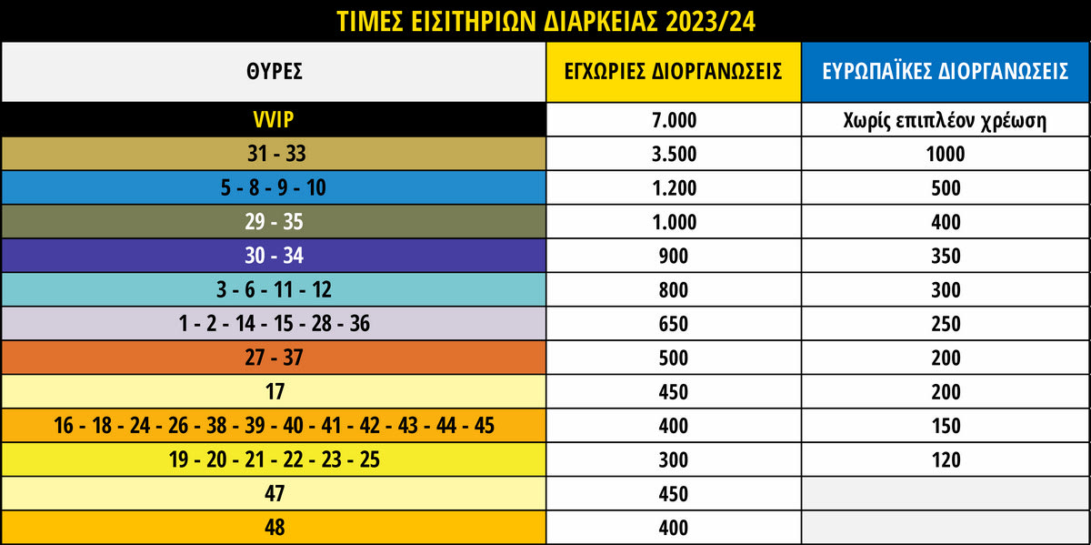 Τα εισιτήρια διαρκείας για το πρωτάθλημα και το Κύπελλο Ελλάδας κυκλοφορούν ακριβώς στις ίδιες τιμές με αυτές της περιόδου 2022-2023. Επιπλέον παρέχεται η ευκαιρία να αγοράσεις σε προνομιακή τιμή τη θέση σου για όλη τη σεζόν και για τα ευρωπαϊκά παιχνίδια της ΑΕΚ.