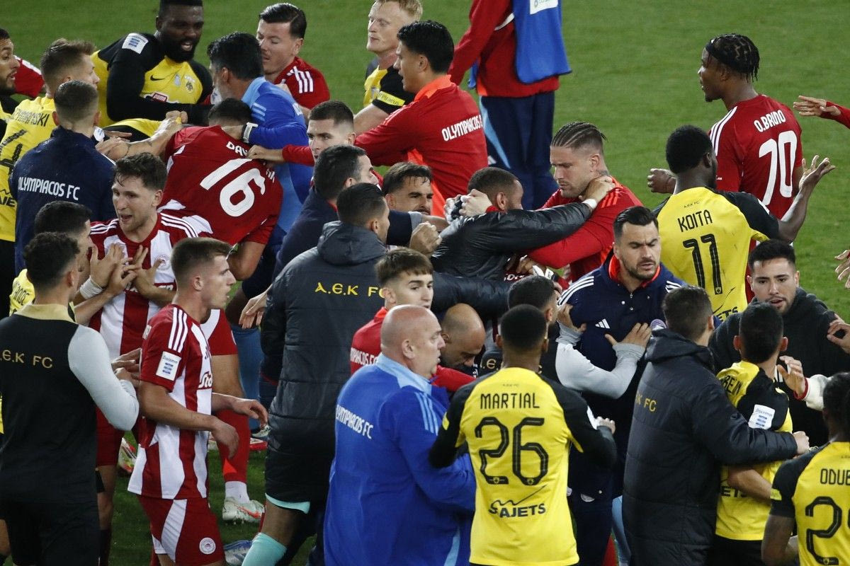 Μετά το τέλος του ντέρμπι του Ολυμπιακού με την ΑΕΚ άρχισε σύρραξη παικτών των δύο ομάδων στον αγωνιστικό χώρο του “Γ. Καραϊσκάκης”, η οποία συνεχίστηκε στη φυσούνα του φαληρικού γηπέδου.