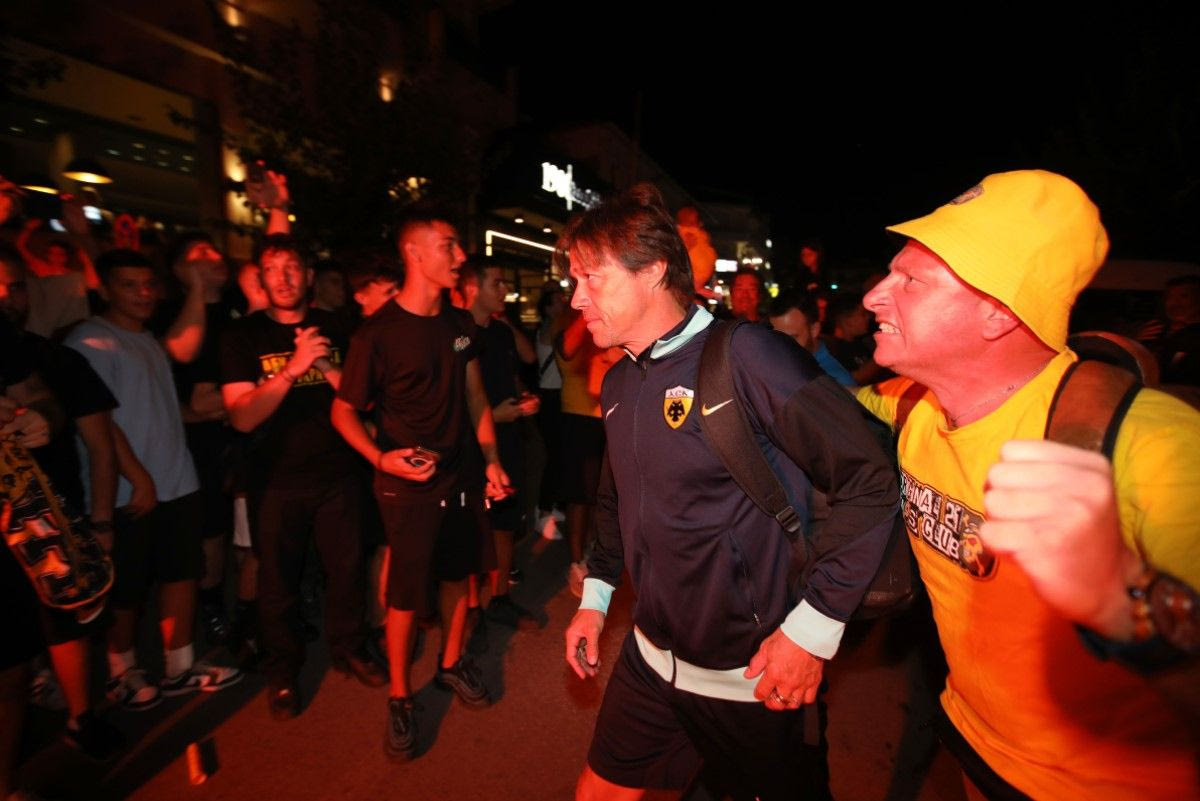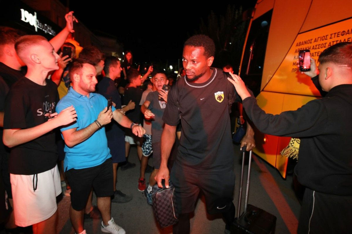 Αποθεωτική υποδοχή για την αποστολή της ΑΕΚ στη Λιβαδειά, με τους φίλους της ομάδας να περιμένουν τον Ματίας Αλμέιδα και τους παίκτες του για να τους χειροκροτήσουν και να φωνάξουν συνθήματα.