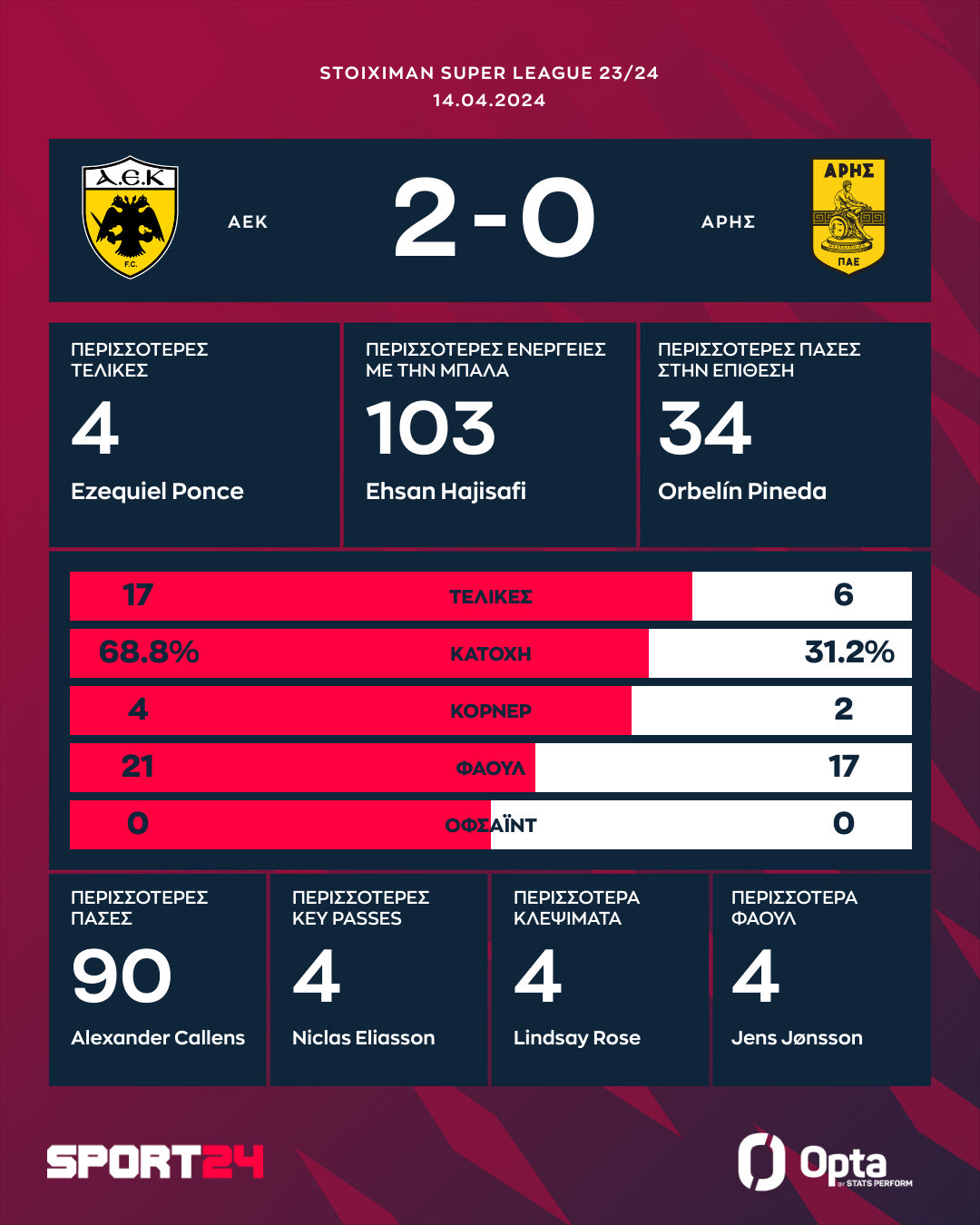 Η ΑΕΚ καθάρισε από νωρίς τον Άρη με 2-0, χάρη στα γκολ που πέτυχε ο Εσέκιελ Πόνσε στο 9′ και το 14′ και γιόρτασε για μια ακόμα φορά τον έναν αιώνα ζωής του σωματείου.
