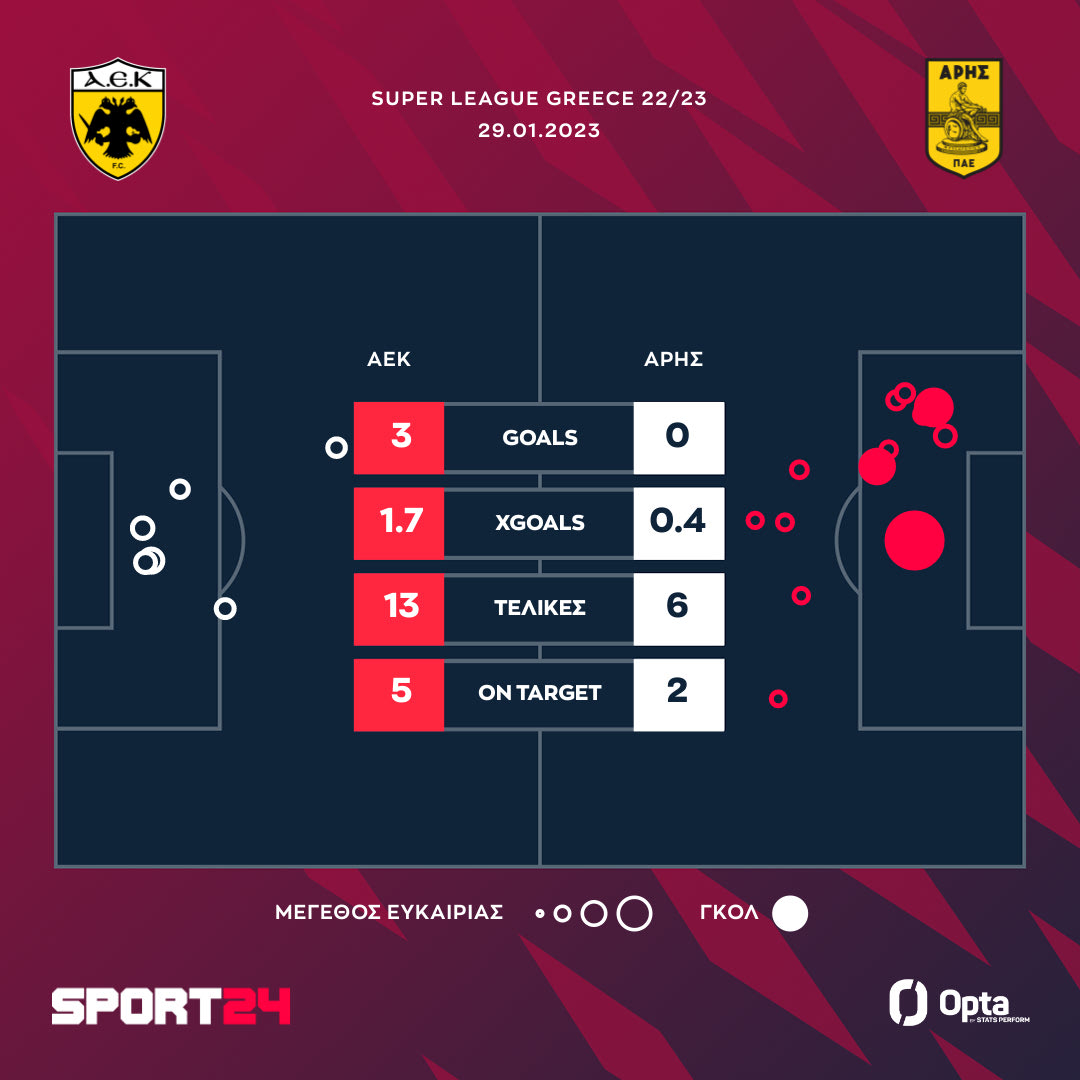 Η ΑΕΚ ήταν καλύτερη από τον Άρη στο μεγαλύτερο κομμάτι του ματς και επικράτησε με 3-0 στην OPAP Arena. Άμραμπατ, Γκατσίνοβιτς και Πινέδα ήταν οι σκόρερ για την ομάδα του Ματίας Αλμέιδα, με τον Αραούχο να κερδίζει πέναλτι και να μοιράζει δύο ασίστ.
