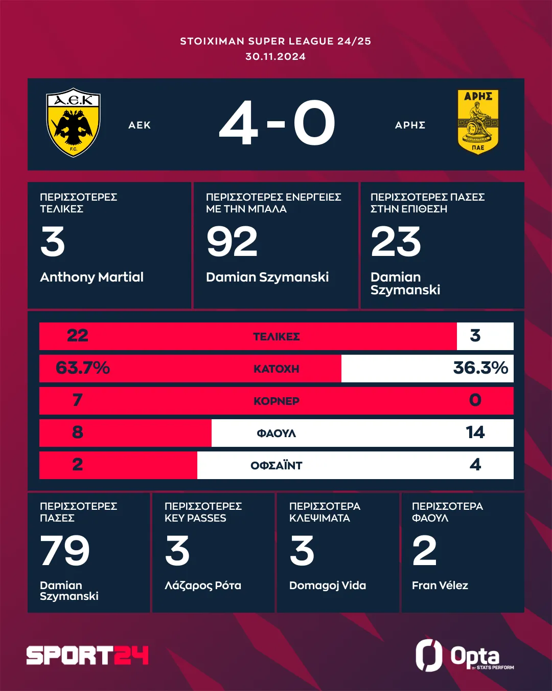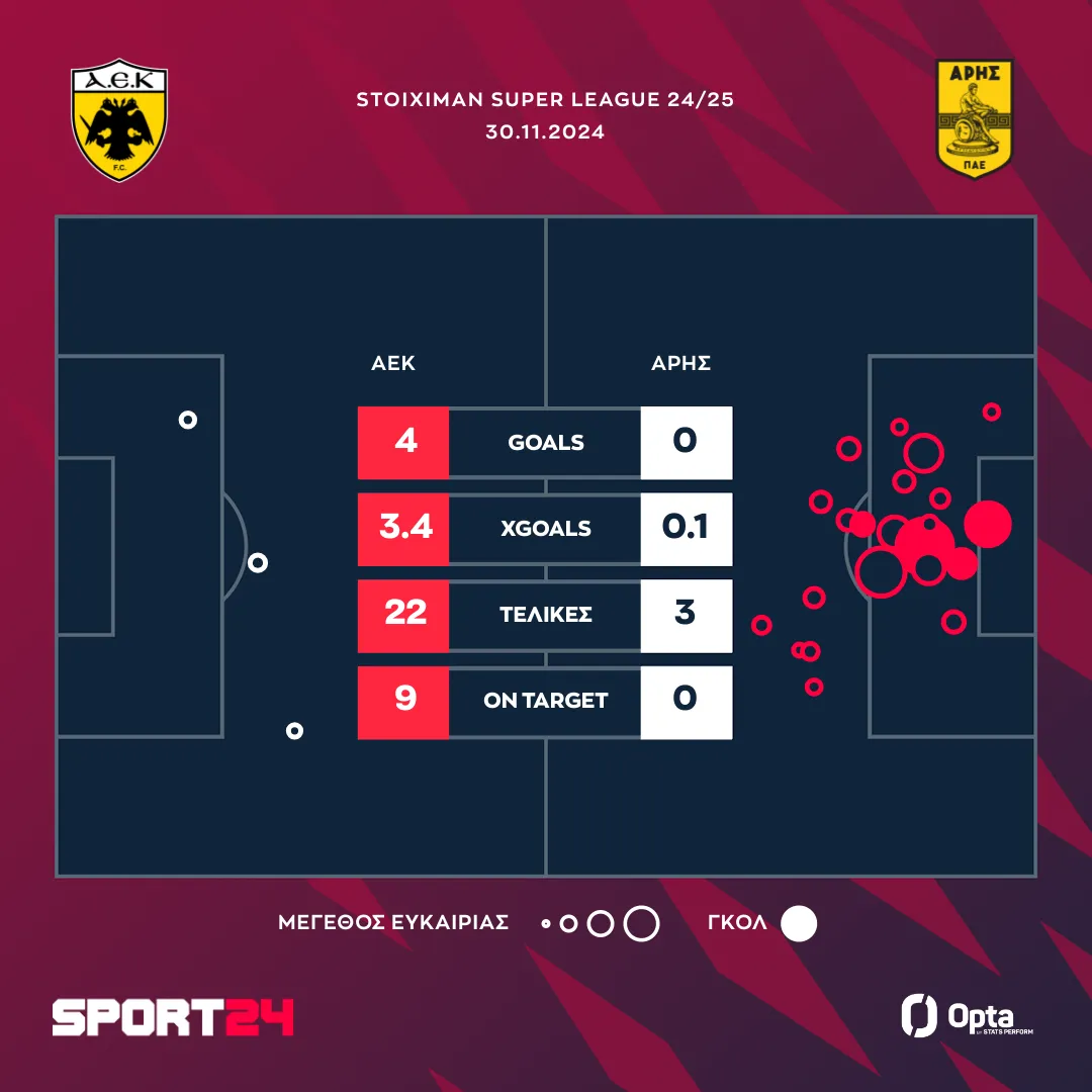 Με αυτούς τους τρεις βαθμούς η ΑΕΚ ανέβηκε στους 24 και είναι προσωρινά δεύτερη, ενώ ο Άρης έμεινε πέμπτος έχοντας 21.