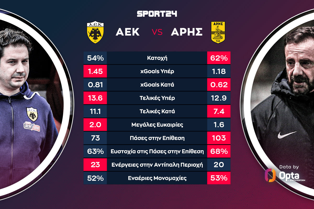 Το πρώτο ντέρμπι του Γιαννίκη και η βελτίωση της ομάδας του Μάντζιου που δεν φαίνεται στη βαθμολογία. Ο Θέμης Καίσαρης αναλύει με τα στοιχεία της Opta τις κατηγορίες που ΑΕΚ και Άρης "κερδίζουν" ο ένας τον άλλον.