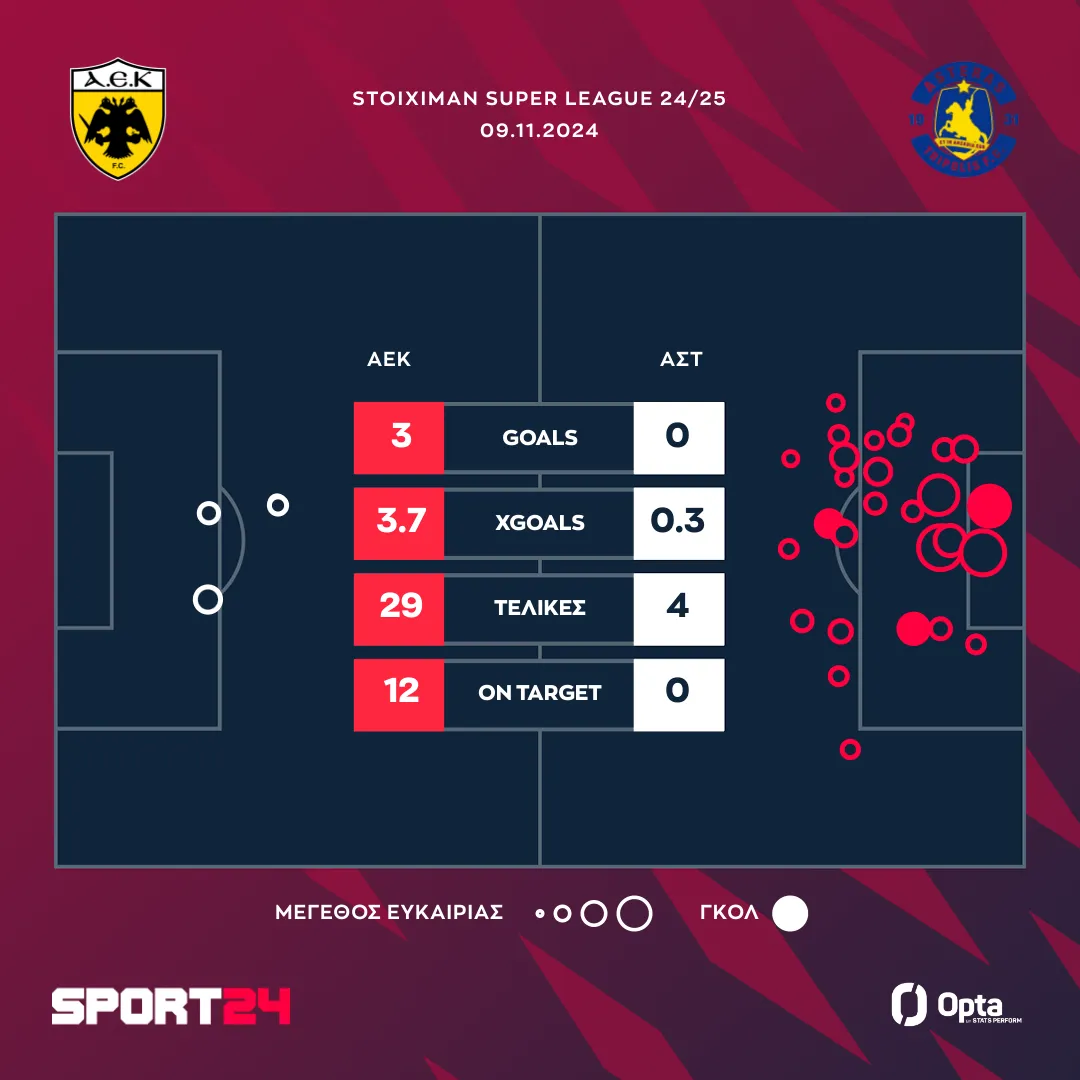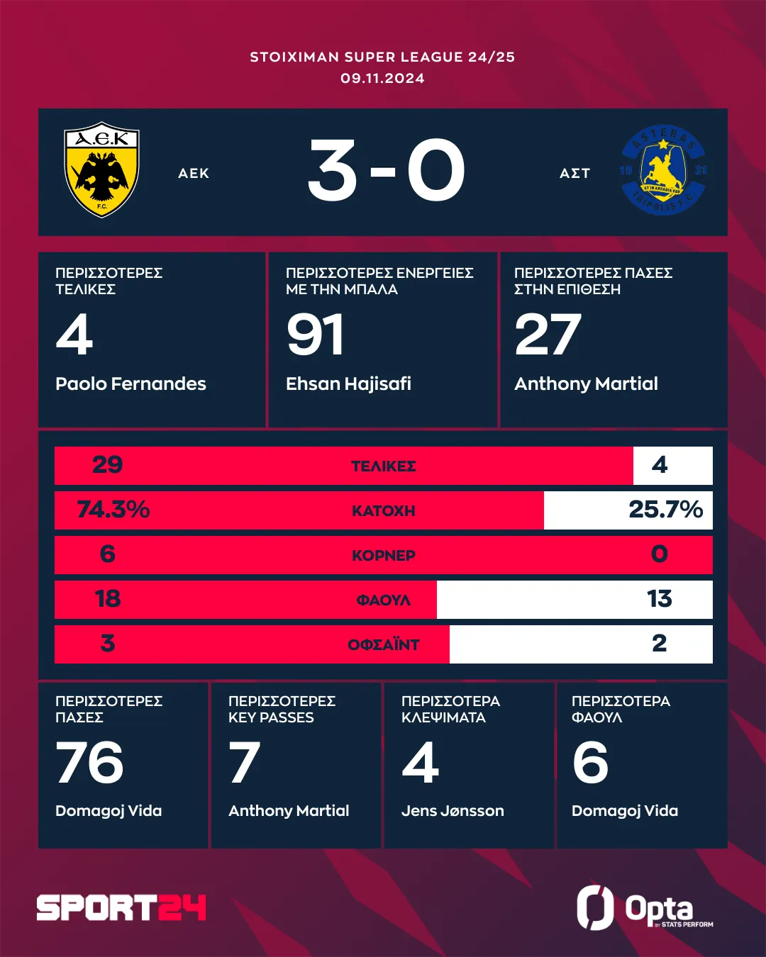 Η ΑΕΚ με αυτό το τρίποντο ανέβηκε στους 21, πιάνοντας τον Άρη στην πρώτη θέση της βαθμολογίας, ενώ ο Αστέρας AKTOR έμεινε στους 16.
