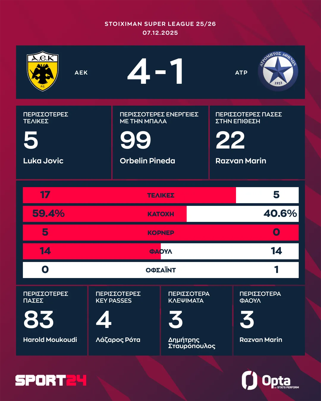 Η ΑΕΚ ξεπέρασε με άνεση το εμπόδιο του Ατρομήτου στην OPAP Arena επικρατώντας με 4-1 για τη 13η αγωνιστική της Stoiximan Super League. Ο Γιόβιτς πέτυχε δύο γκολ, ενώ το σκορ άνοιξε ο Πινέδα με τον Τσαντίλα να μειώνει προσωρινά και τον Λιούμπιτσιτς να διαμορφώνει το τελικό σκορ. Ο Μιγιάτ Γκατσίνοβιτς αποχώρησε τραυματίας προκαλώντας ανησυχία στο κιτρινόμαυρο στρατόπεδο.