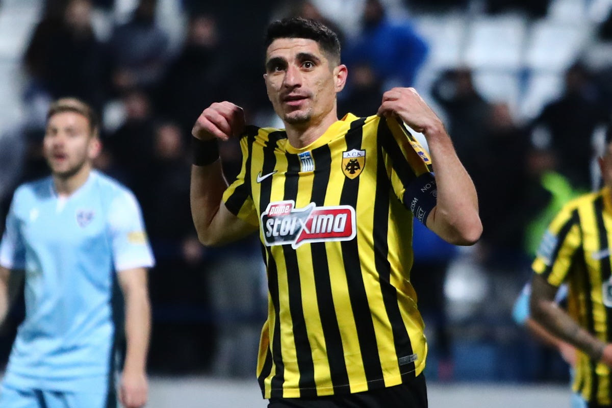 Ο Πέτρος Μάνταλος πανηγυρίζει γκολ του στο Ιωνικός - ΑΕΚ