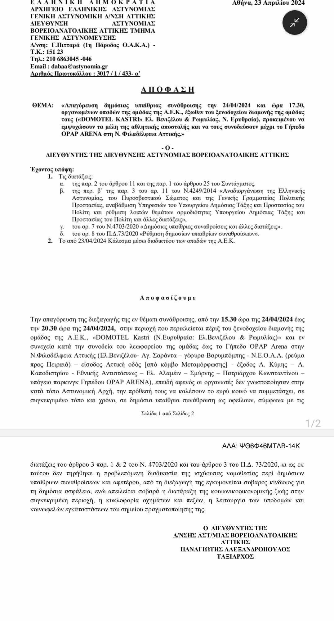 Συγκεκριμένα η Διεύθυνση Αστυνομίας της Βορειοανατολικής Αττικής απαγορεύει τη συνάθροιση στον συγκεκριμένο χώρο από τις 15:30 έως και τις 20:30, καθώς οι οργανωτές δεν γνωστοποίησαν στην κατά τόπο Αστυνομική Αρχή την πρόθεσή τους να καλέσουν ευρύ κοινό να συμμετάσχει σε συγκεκριμένο τόπο και χρόνο σε δημόσια υπαίθρια συνάθροιση. Παράλληλα απαγορεύτηκε στους οπαδούς και η συνοδεία της αποστολής με μηχανοκίνητη πορεία.