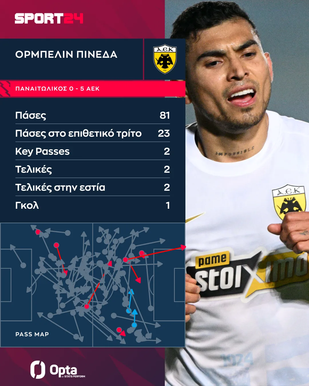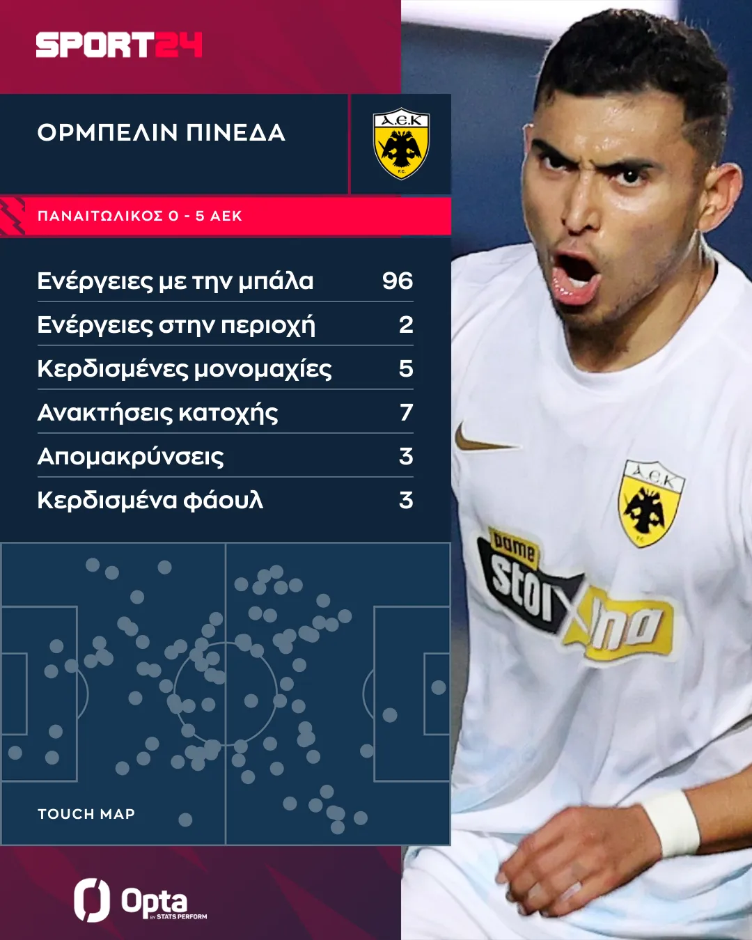 Ο Ορμπελίν Πινέδα χαμογελάει ξανά φέτος και μαζί του χαμογελάνε και οι φίλαθλοι της ΑΕΚ, που βλέπουν την αρμάδα του Μάρκο Νίκολιτς να “πετάει”. Το SPORT24 σάς παρουσιάζει όλο όσα έκανε ο διεθνής Μεξικανός χαφ κόντρα στον Παναιτωλικό, στο παιχνίδι δηλαδή που ο 29χρονος “όργωσε” όλο το γήπεδο δίνοντας παράλληλα έδωσε το έναυσμα της νίκης.
