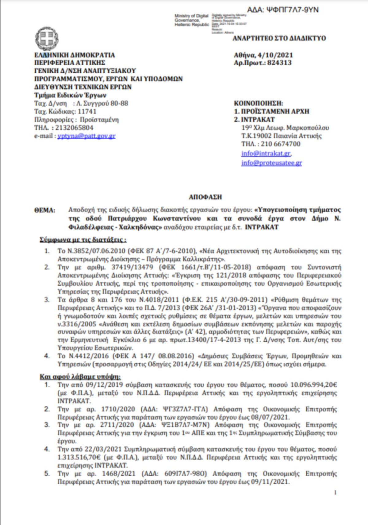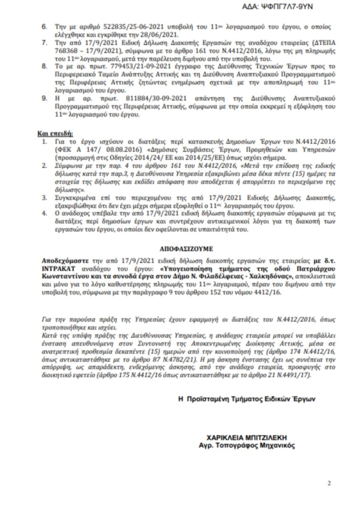 “Αποδεχόμαστε την από 17/9/2021 ειδική δήλωση διακοπής εργασιών της εταιρείας με δ.τ. ΙΝΤΡΑΚΑΤ αναδόχου του έργου: «Υπογειοποίηση τμήματος της οδού Πατριάρχου Κωνσταντίνου και τα συνοδά έργα στον Δήμο Ν. Φιλαδέλφειας – Χαλκηδόνας», αποκλειστικά και μόνο για το λόγο καθυστέρησης πληρωμής του 11ου λογαριασμού, πέραν του διμήνου από την υποβολή του, σύμφωνα με την παράγραφο 9 του άρθρου 152 του νόμου 4412/16” αναφέρει η απόφαση στο έγγραφο που αναρτήθηκε στη Διαύγεια.