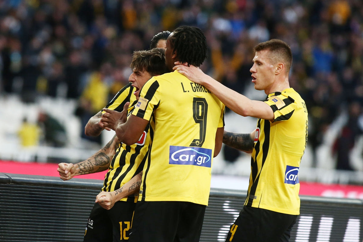 Οι παίκτες της ΑΕΚ πανηγυρίζουν γκολ κόντρα στον Άρη