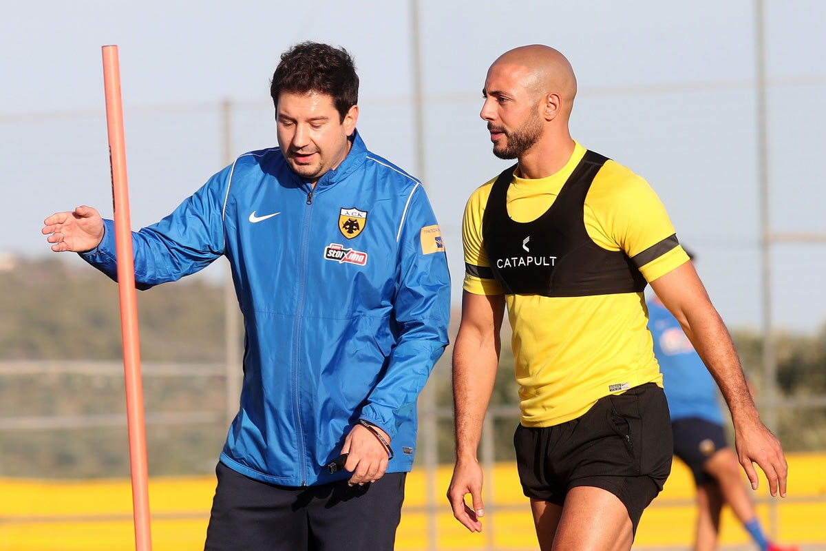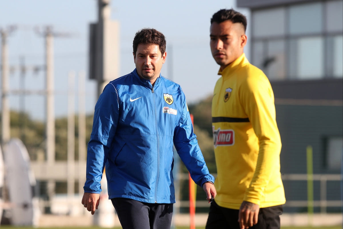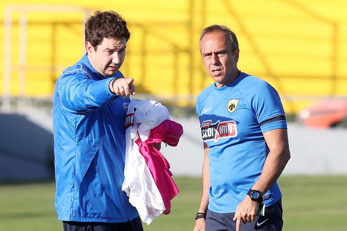 Ο Αργύρης Γιαννίκης με τον Λιβάι Γκαρσία στην προπόνηση της ΑΕΚ Photo Credits: INTIME