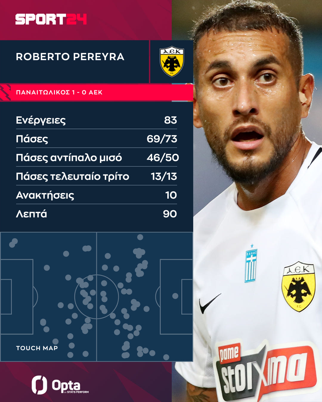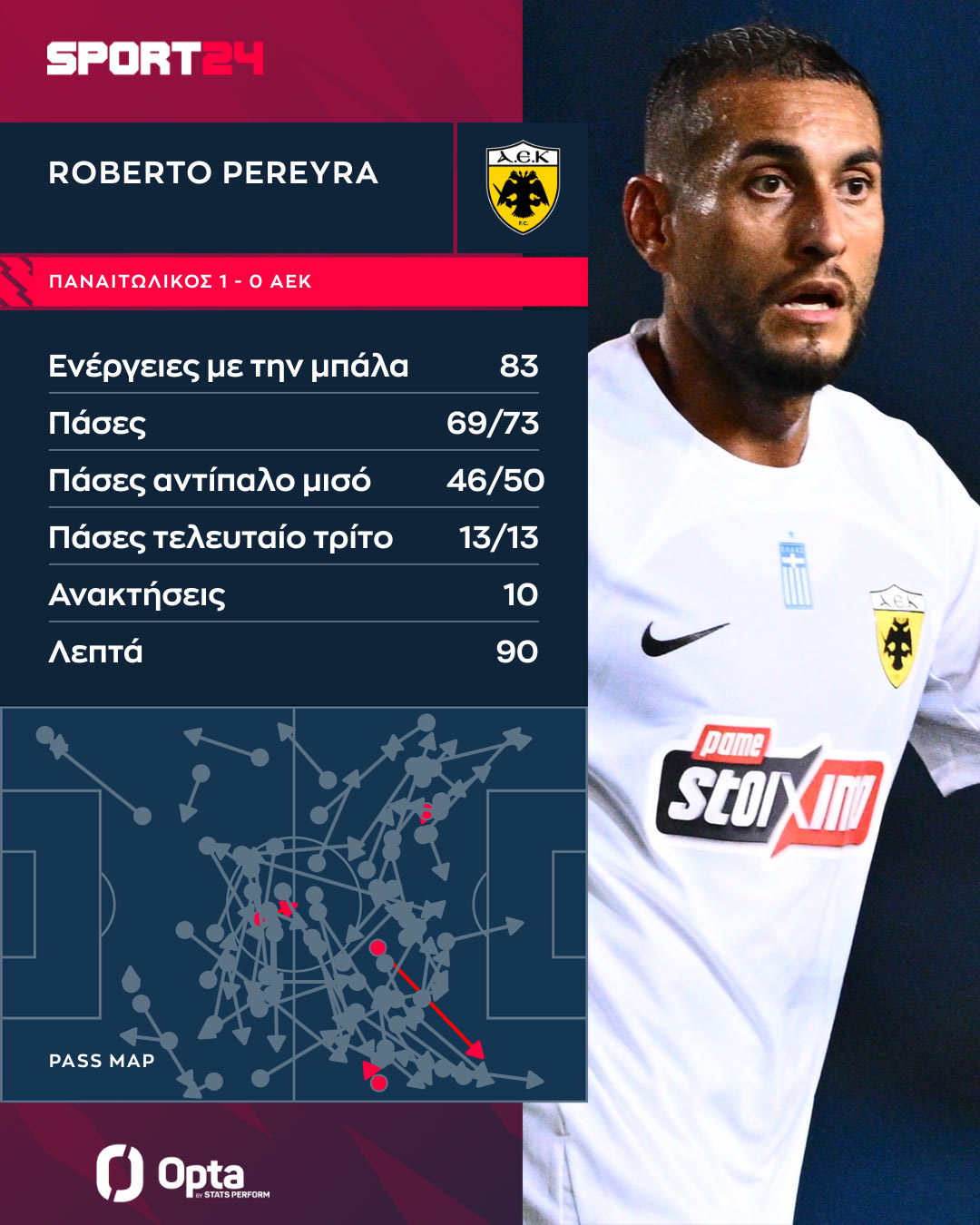 Συνολικά ο Περέιρα είχε 69/73 εύστοχες πάσες με τις περισσότερες εξ αυτών να είναι στο μισό του Παναιτωλικού 46/50.Συνολικά ο Αργεντινός ήταν ο ποδοσφαιριστής με τις περισσότερες πάσες στο χορτάρι.