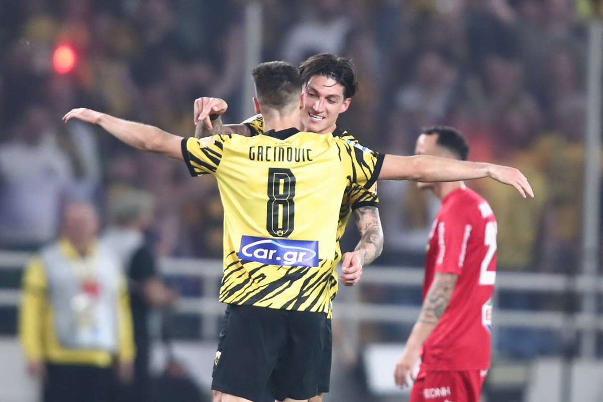 Οι Μιγιάτ Γκατσίνοβιτς και Στίβεν Τσούμπερ πανηγυρίζουν ένα από της ΑΕΚ επί του Βόλου