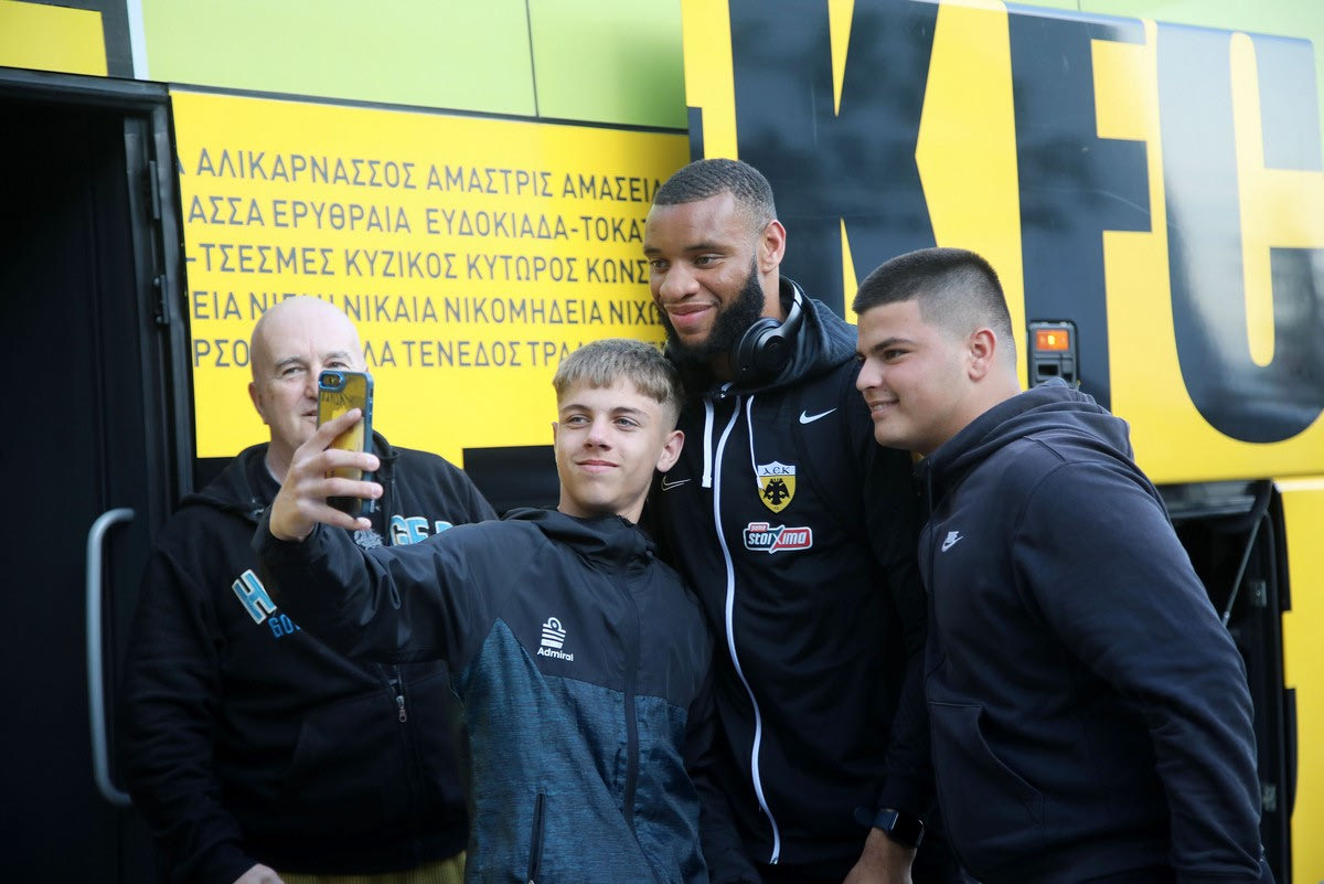 Κόσμος βρέθηκε έξω από το ξενοδοχείο, ανάμεσα τους και πολλά παιδιά, και φωτογραφήθηκε με τους ποδοσφαιριστές της ΑΕΚ, όπως και με τον Ματίας Αλμέιδα.