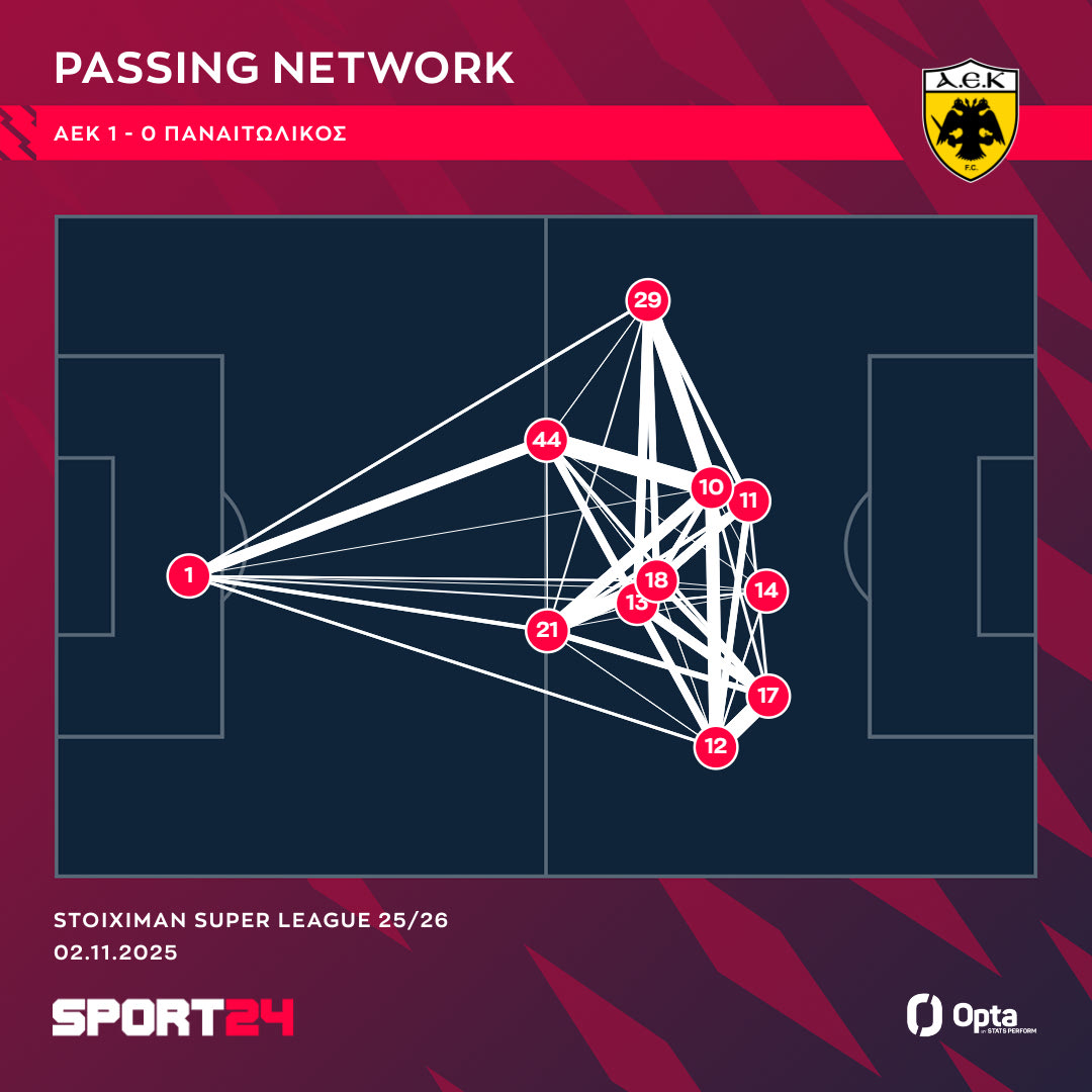 Μία στιγμή άρτιας κυκλοφορίας της μπάλας και συνδυαστικού παιχνιδιού, μαζί με ομολογουμένως λίγη δόση τύχης, έφτασαν στην ΑΕΚ για να τιμωρήσει το αμυντικό και σφιχτό πλάνο του Παναιτωλικού στο ματς της Νέας Φιλαδέλφειας για την 9η αγωνιστική της Stoiximan Super League.