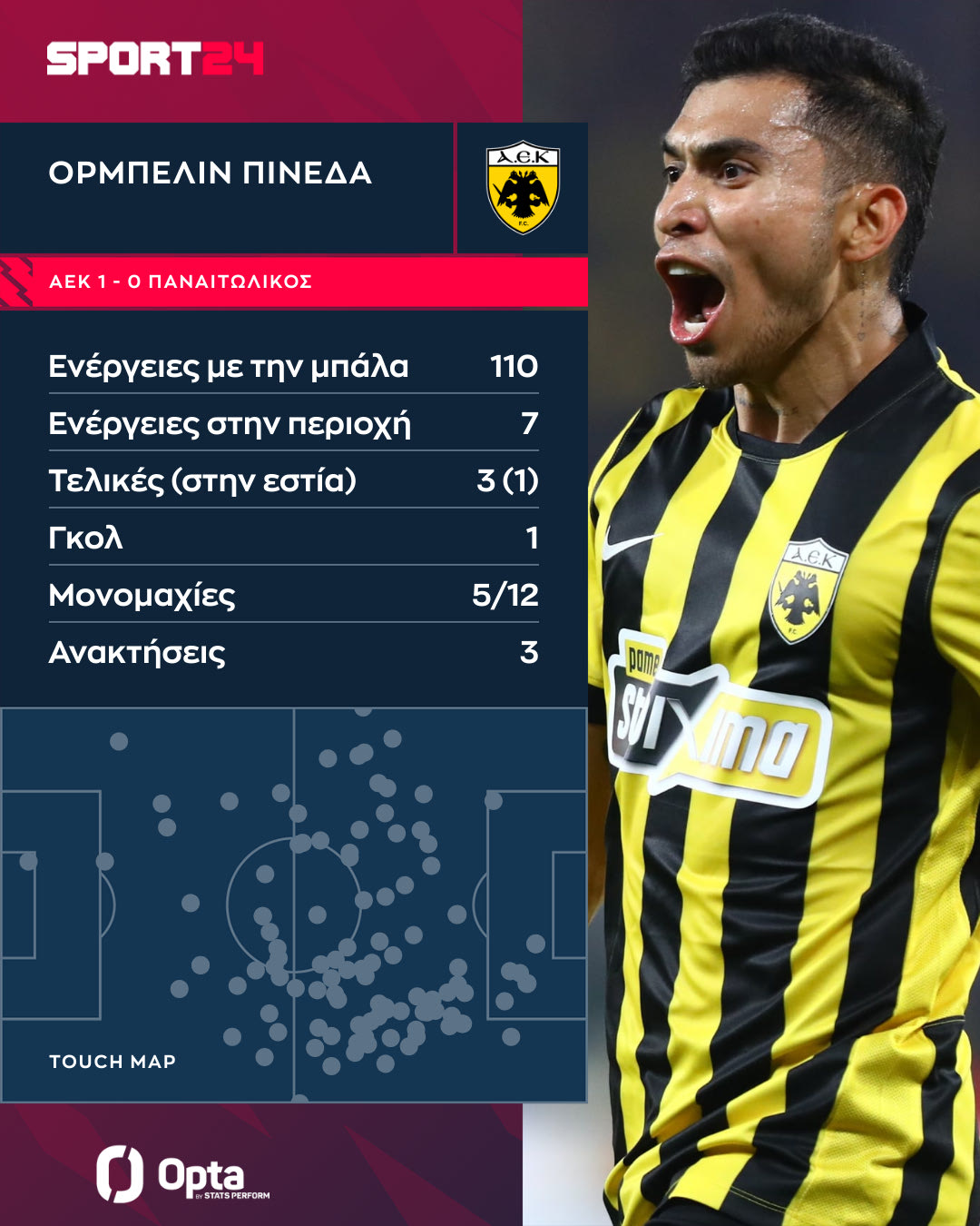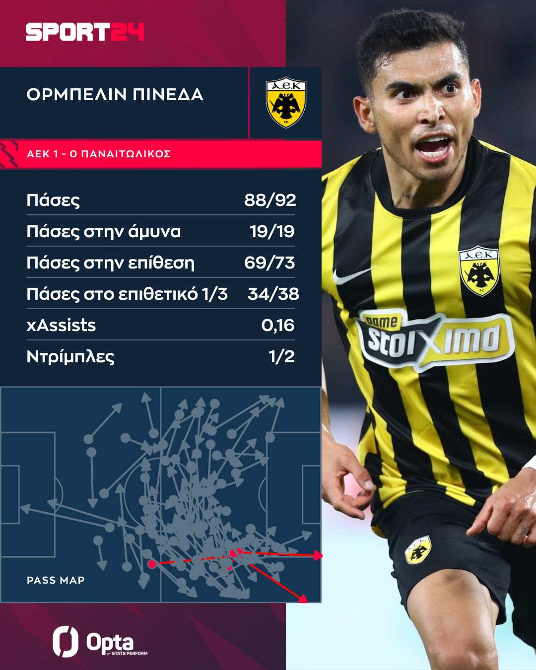 Ο Ορμπελίν Πινέδα που λύτρωσε την ΑΕΚ με το πρώτο του γκολ μετά από εννέα μήνες και η ολοκληρωτική εμφάνιση του Μεξικανού χαφ που θύμισε κάτι από τα παλιά. Το SPORT24 με τη βοήθεια της OPTA/Stats Perform σάς παρουσιάζει όλα όσα έκανε ο 29χρονος κόντρα στον Παναιτωλικό και τις κορυφές που “έπιασε”.
