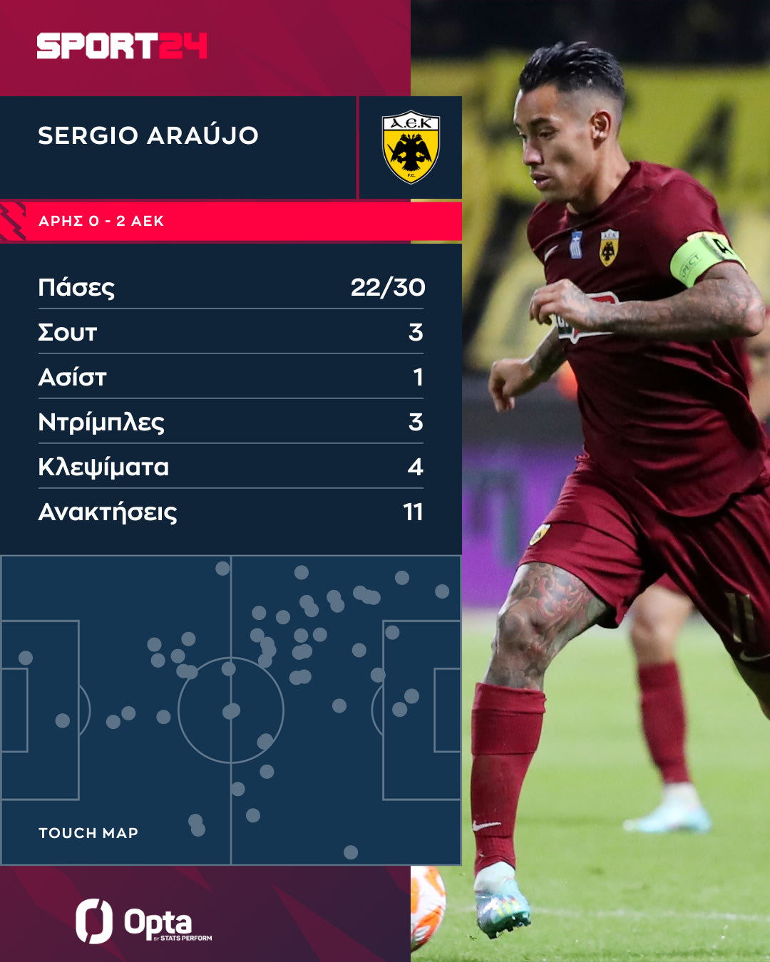 Ωστόσο, η ελευθερία του Αραούχο είχε καταλυτικό ρόλο και στη γενικότερη θετική παρουσία της ΑΕΚ. Όπως φαίνεται κι από το γράφημα της Opta/Stats Perform, ο έμπειρος επιθετικός πάτησε στο μεγαλύτερο κομμάτι του γηπέδου, κατεβαίνοντας πολλές φορές χαμηλά με στόχο να πιέσει για την ανάκτηση της κατοχής ή να βοηθήσει στην ανάπτυξη.