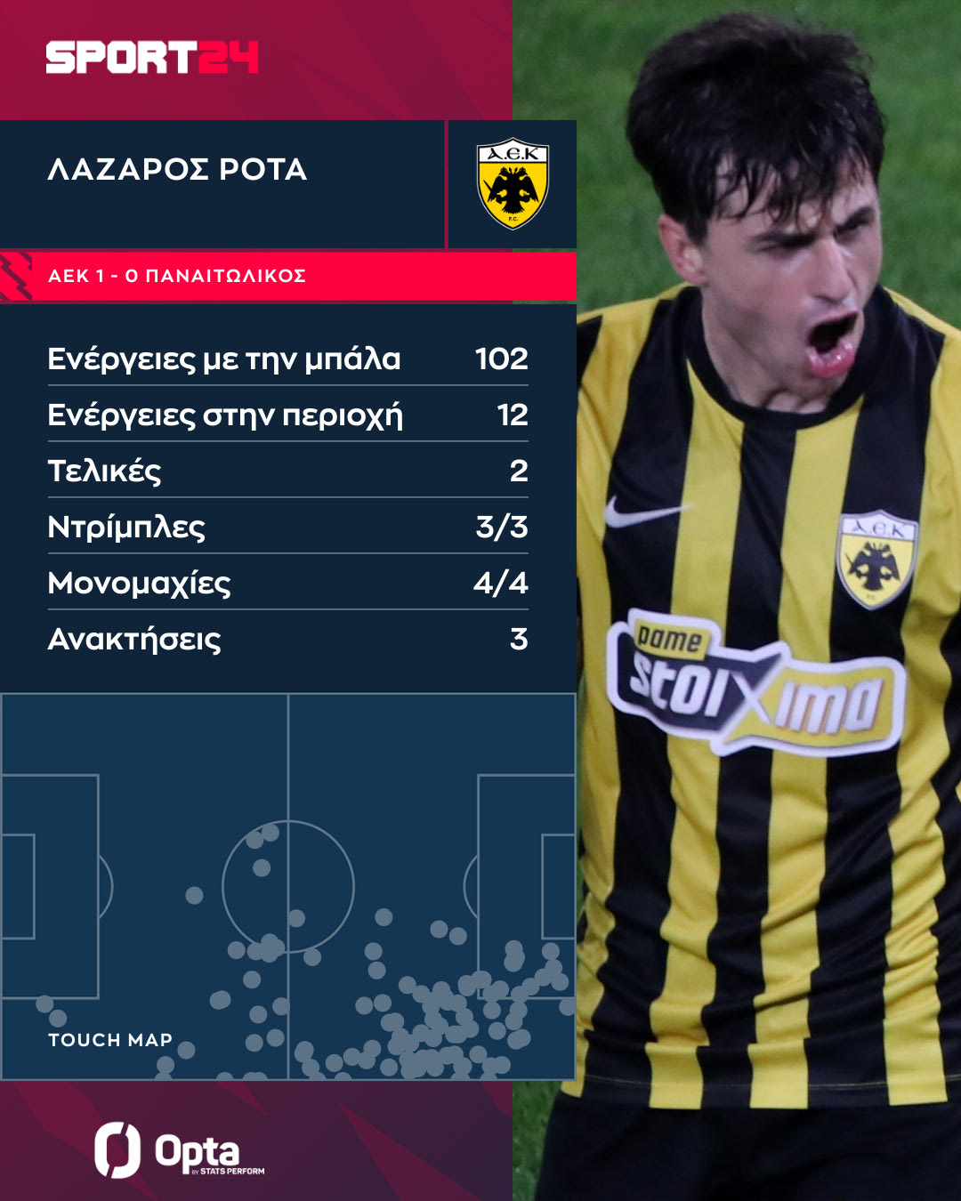 Η “κατασκήνωση” στην επίθεση της ΑΕΚ. Η δυσανάλογη της θέσης του παρουσία στην περιοχή του Παναιτωλικού και το πιο δημιουργικό του ματς φέτος με τη φανέλα της Ένωσης. Η κορυφαία εμφάνιση του Λάζαρου Ρότα μέσα από τα γραφήματα και τα νούμερα της OPTA/Stats Perform.