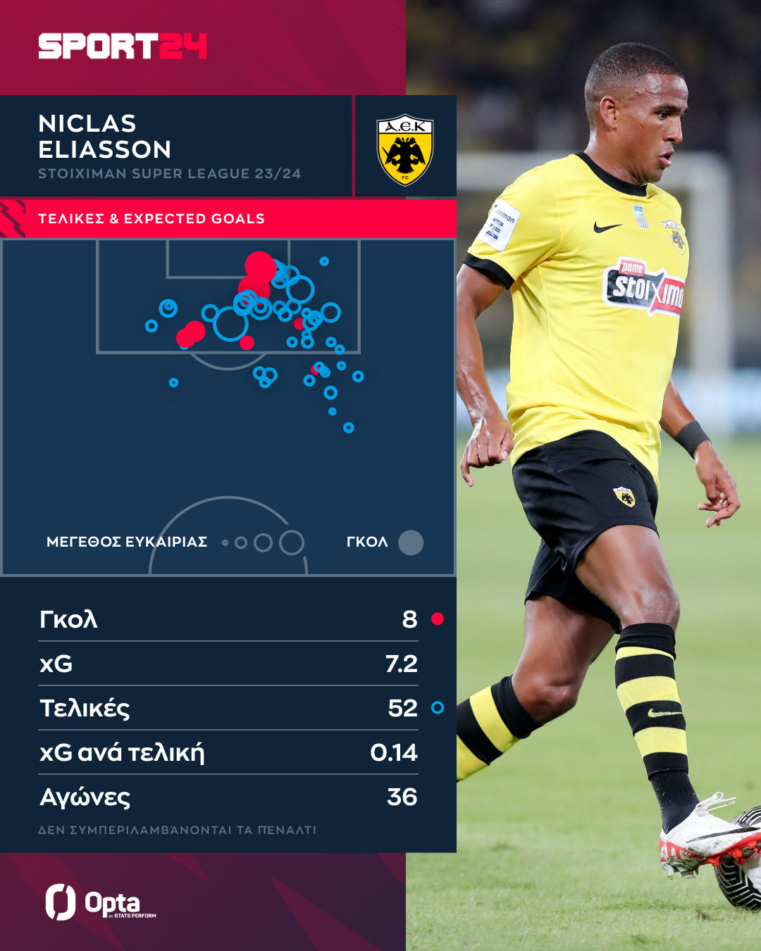 Ο Ελίασον για να πετύχει οκτώ γκολ (κανένα από την άσπρη βούλα) χρειάστηκε 52 τελικές. Η συνολική “αξία” τους ήταν 7.2 xGoals, δείγμα του ότι ο Σουηδός πέτυχε τα αναμενόμενα γκολ με βάση τις ευκαιρίες του. Κατά μέσο όρο η τελική του είχε “αξία” ο.14 xGoals, καθώς (όπως φαίνεται και στο γράφημα της Opta Stats Perform) δεν δίστασε να δοκιμάσει το πόδι του εκτός περιοχής, έχοντας πετύχει και γκολ από εκεί.